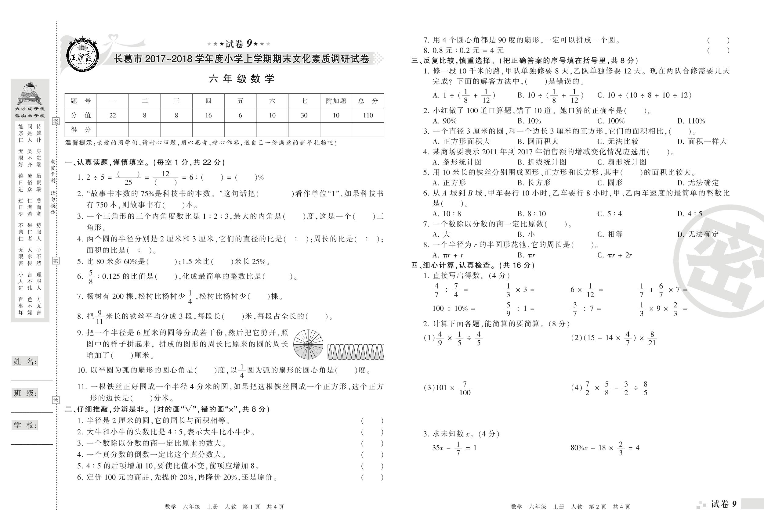 2017-2018学年第一学期长葛市六年级数学试卷(人教版)【9】