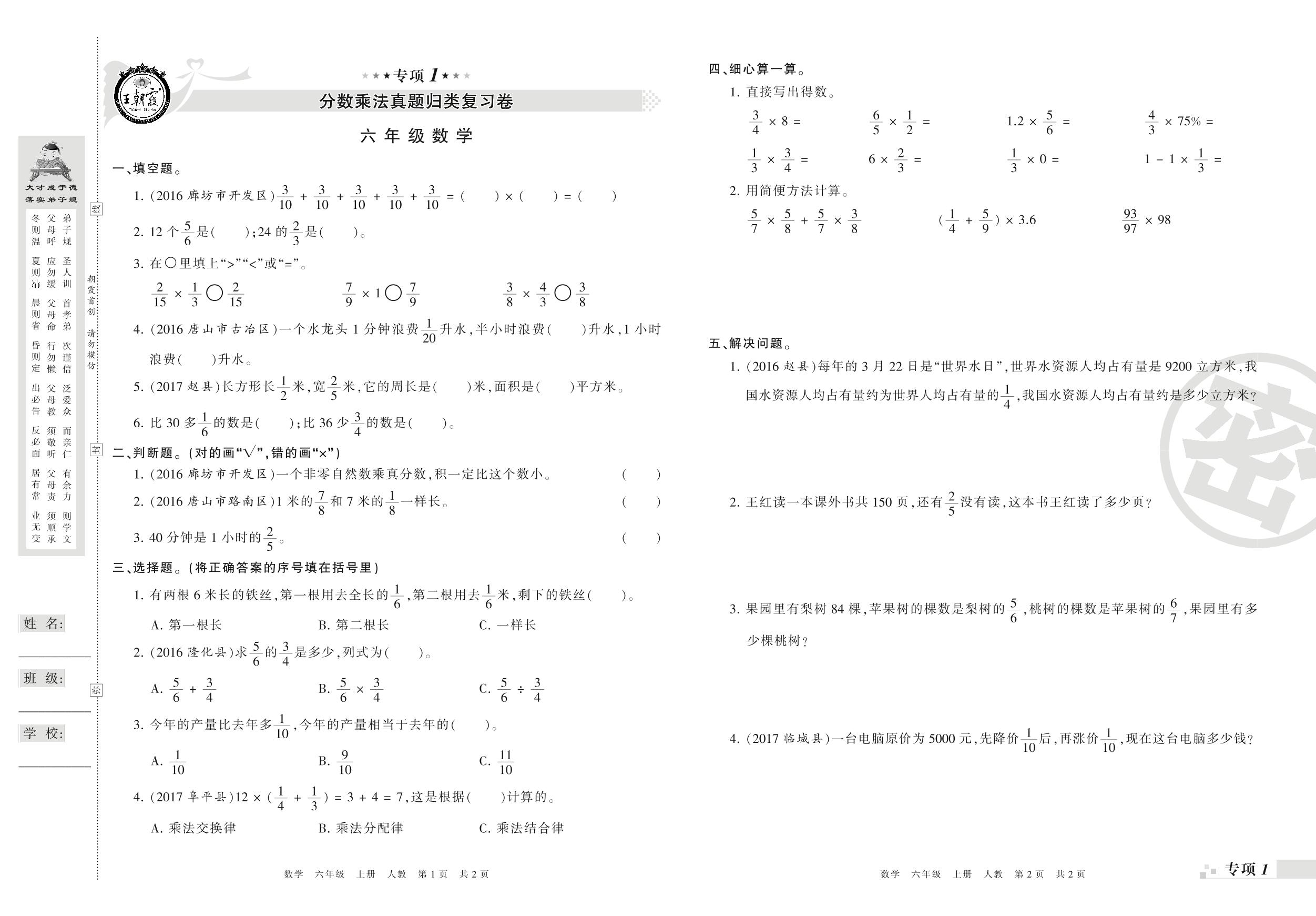 王朝霞期末专项卷——分数乘法、分数除法(一)真题归类复习卷六年级上册数学(人教版)_R210805110108【0】