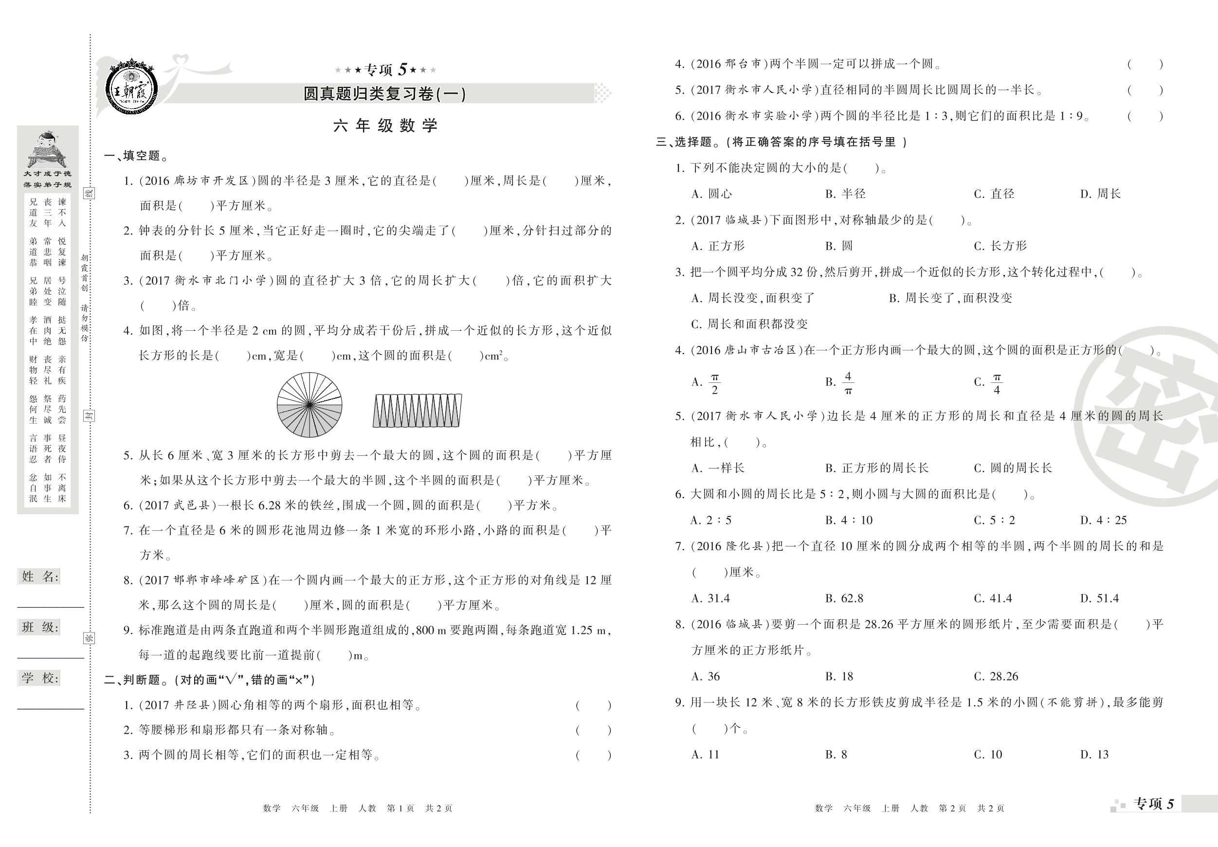 王朝霞期末专项卷——圆(一)(二)真题归类复习卷六年级上册数学(人教版)_R210805110118【0】
