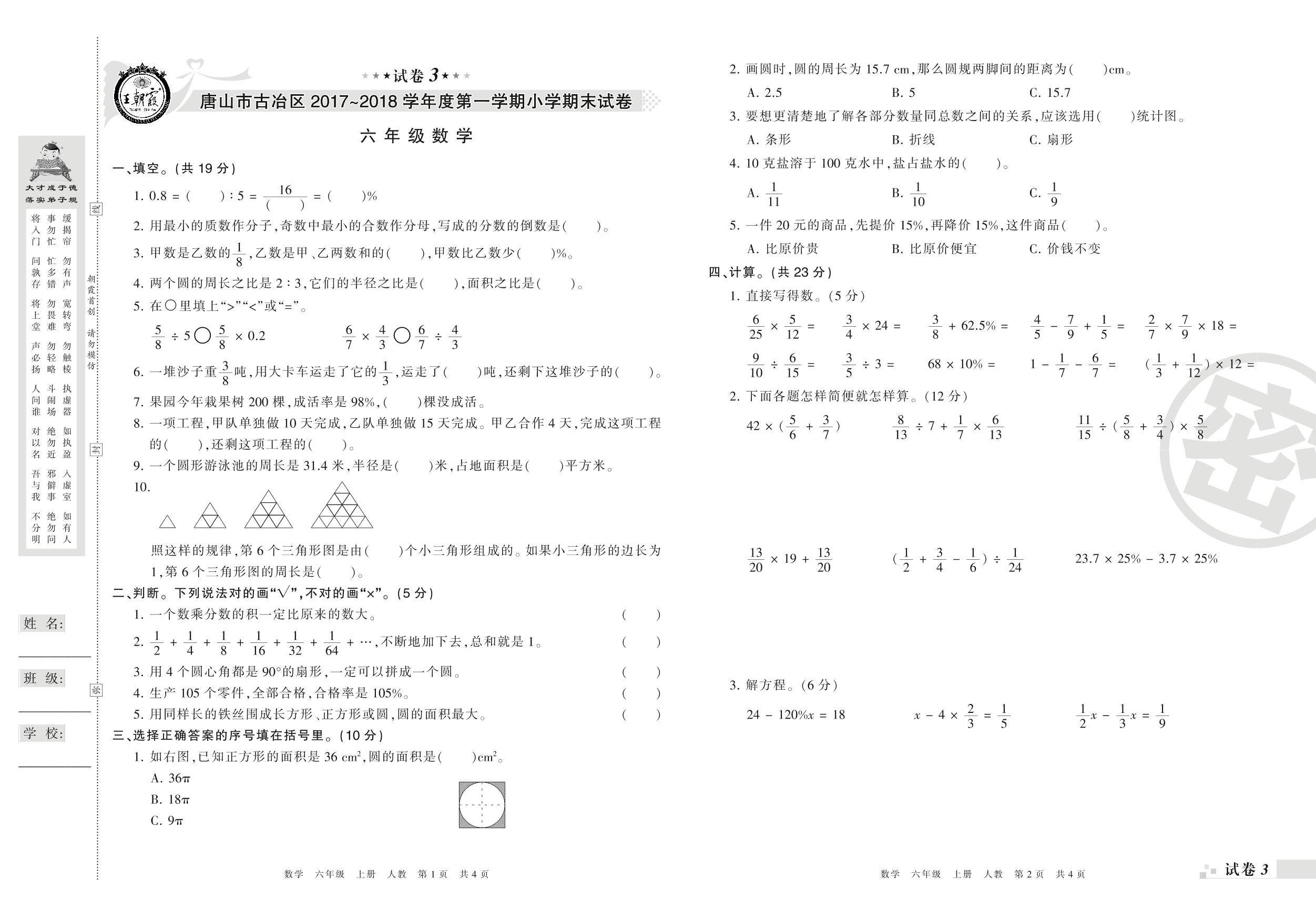 2017-2018学年第一学期唐山市古冶区六年级数学试卷(人教版)【3】