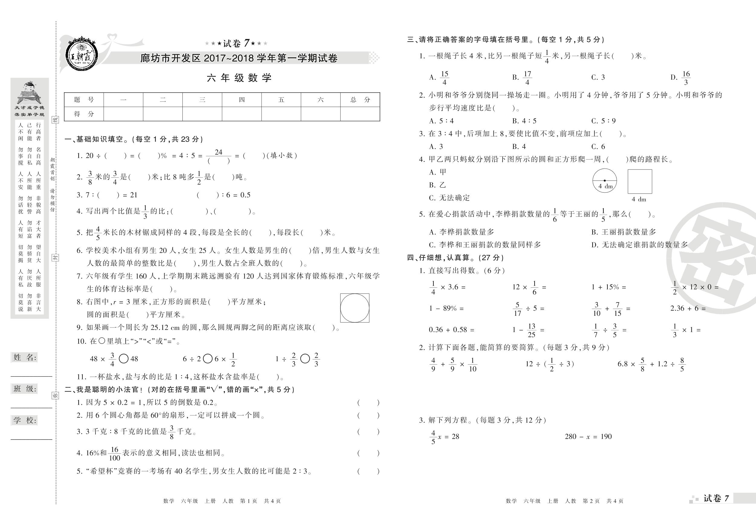 2017-2018学年第一学期廊坊市开发区六年级数学试卷(人教版)【7】