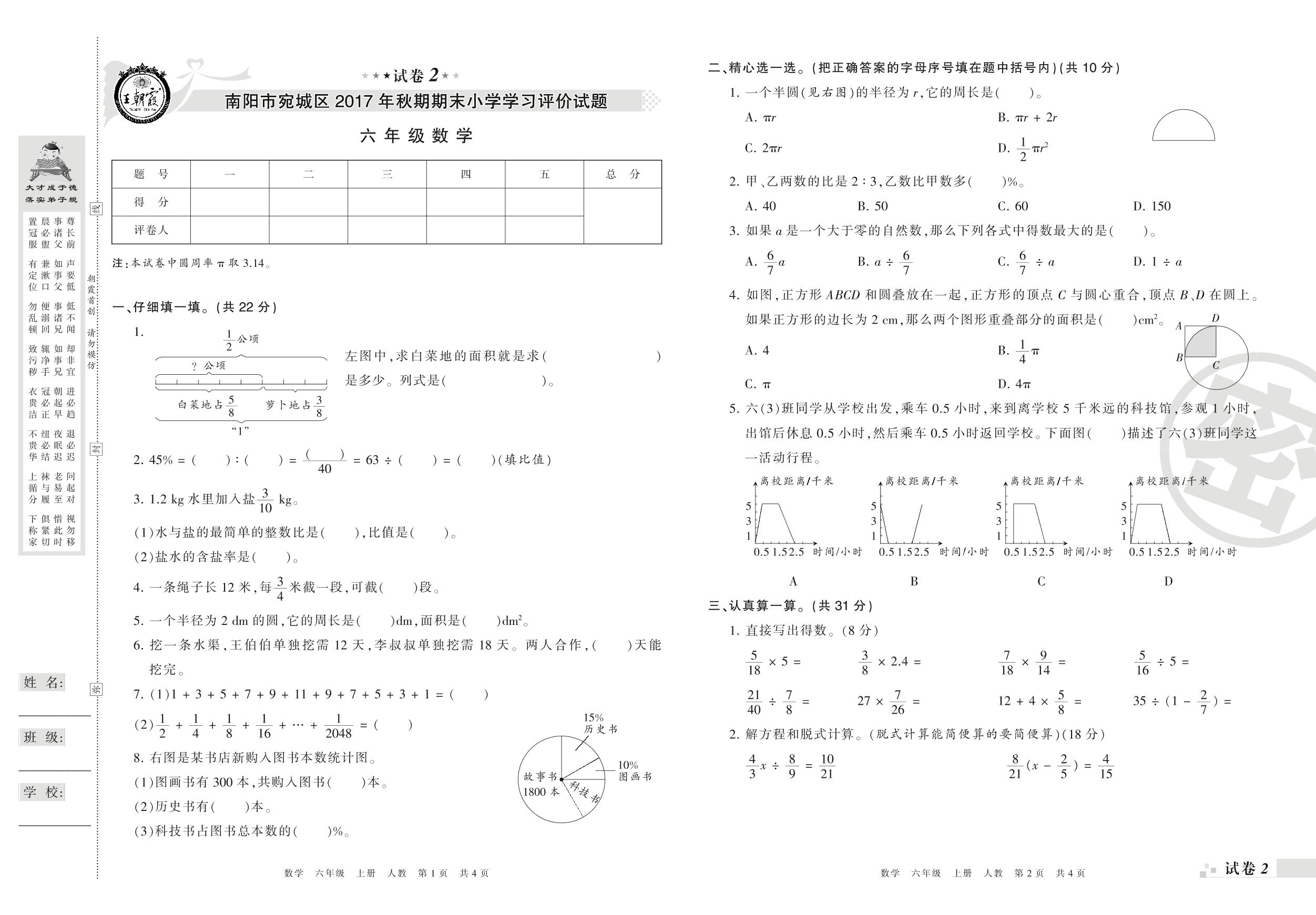 2017-2018学年第一学期南阳市宛城区六年级数学试卷(人教版)【2】