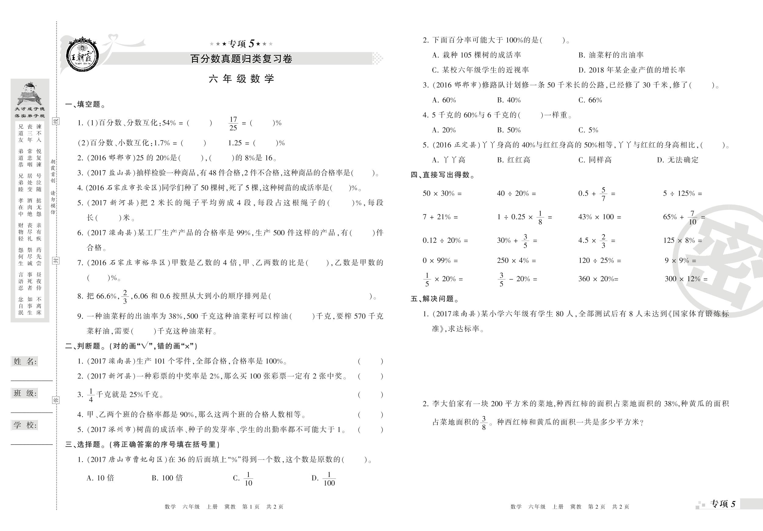 王朝霞期末专项卷——百分数、百分数的应用(一)真题归类复习卷六年级上册数学(冀教版)_R210805110319【0】