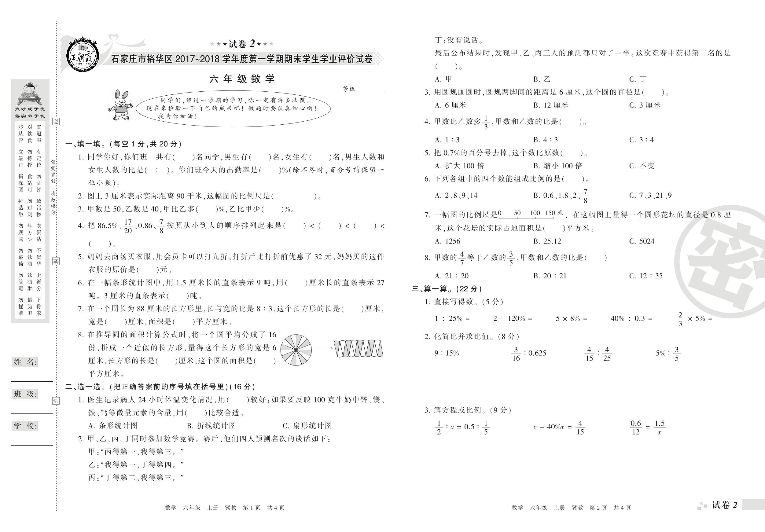 2017-2018学年第一学期石家市市裕华区六年级数学试卷(冀教版)【2】