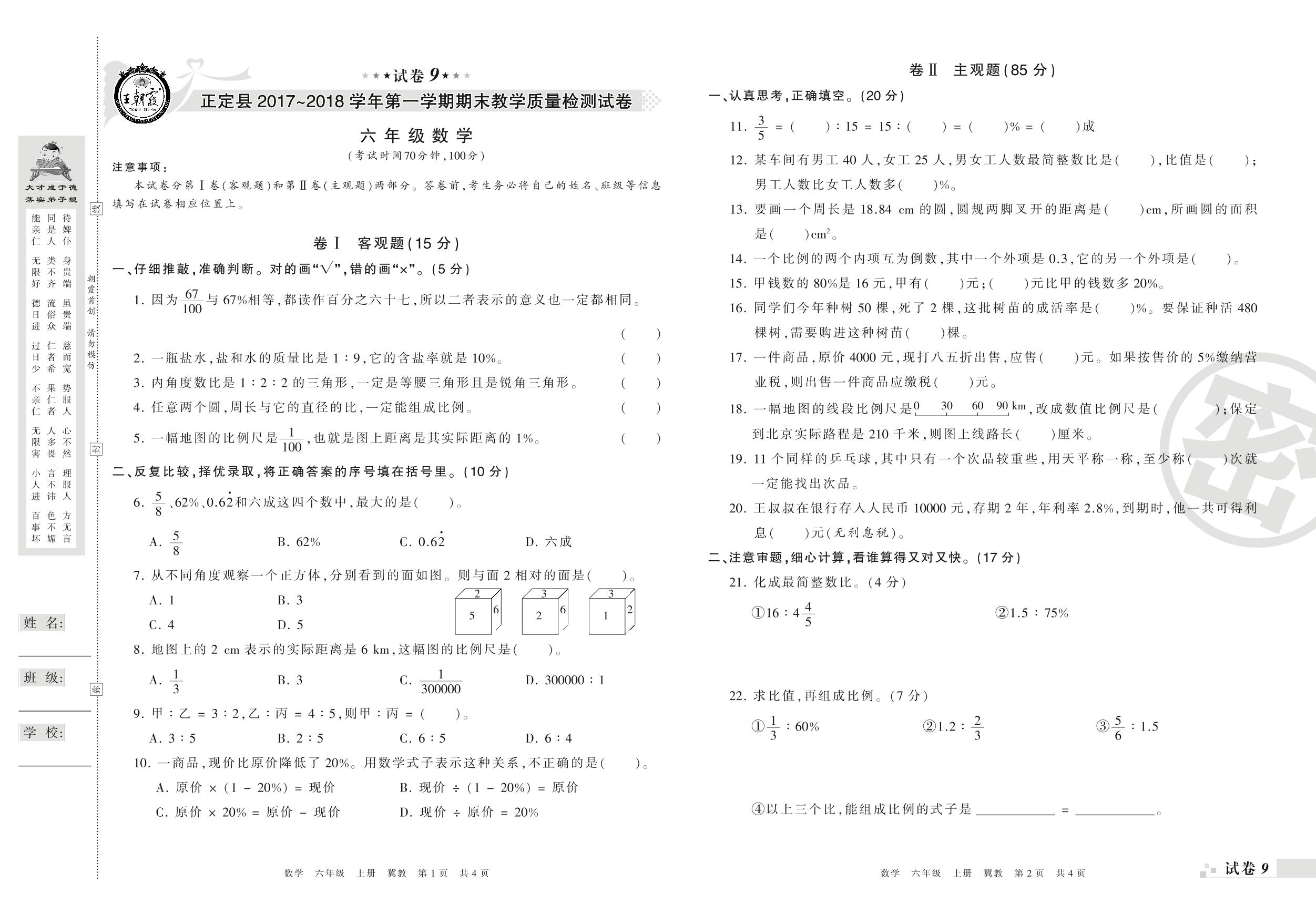 2017-2018学年第一学期石家庄市正定县六年级数学试卷(冀教版)【9】