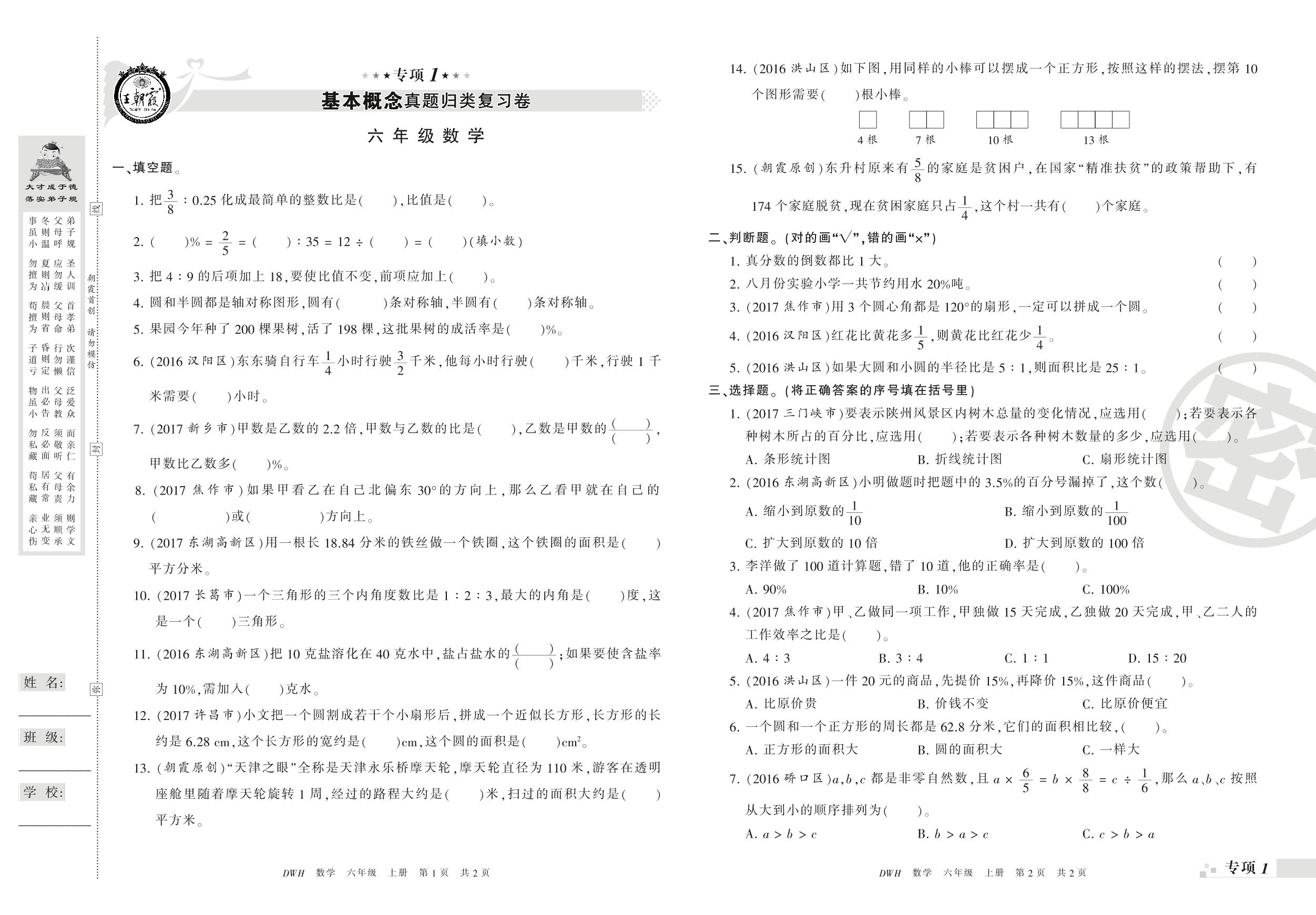 王朝霞期末专项卷——基本概念、计算真题归类复习卷六年级上册数学(人教版)_R210805110435【0】