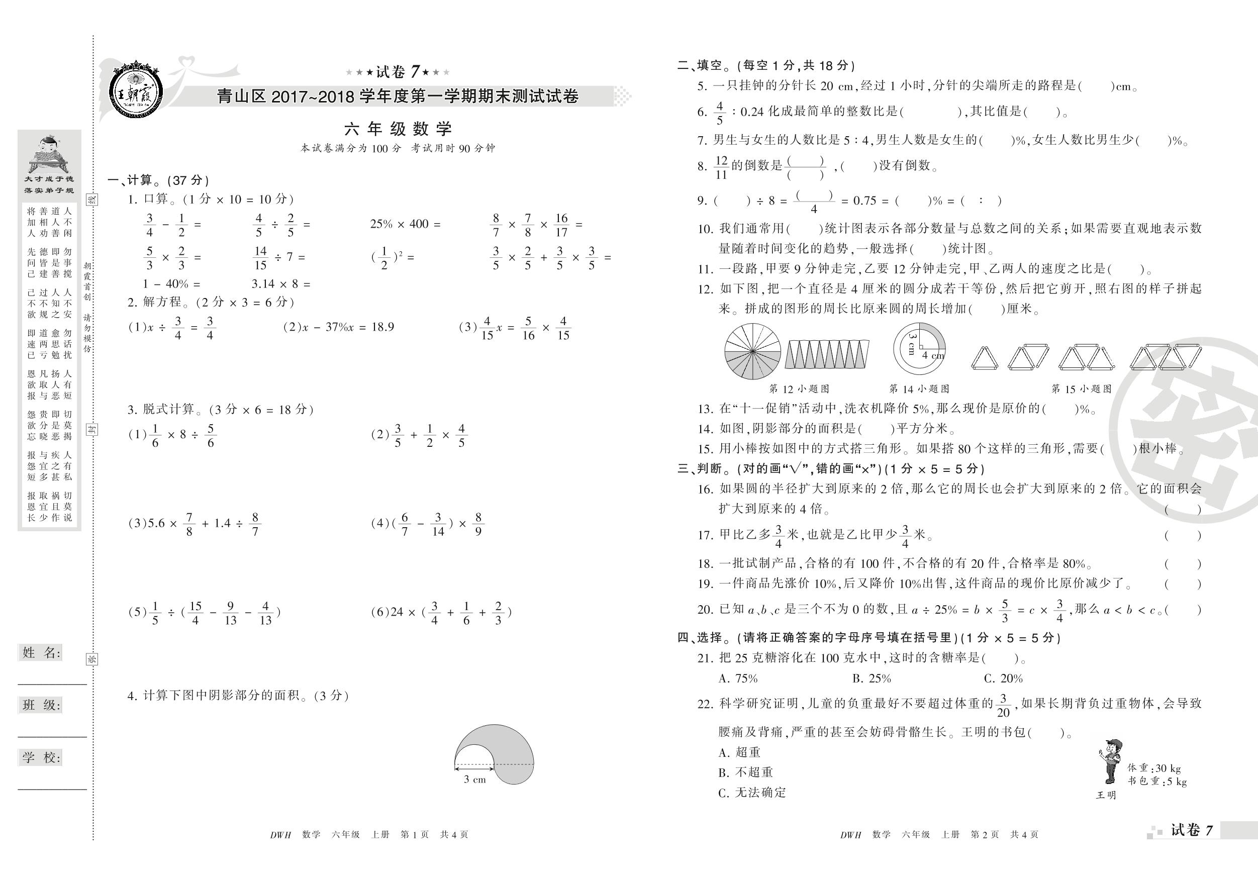 2017-2018学年第一学期武汉市青山区六年级数学试卷(人教版)【7】
