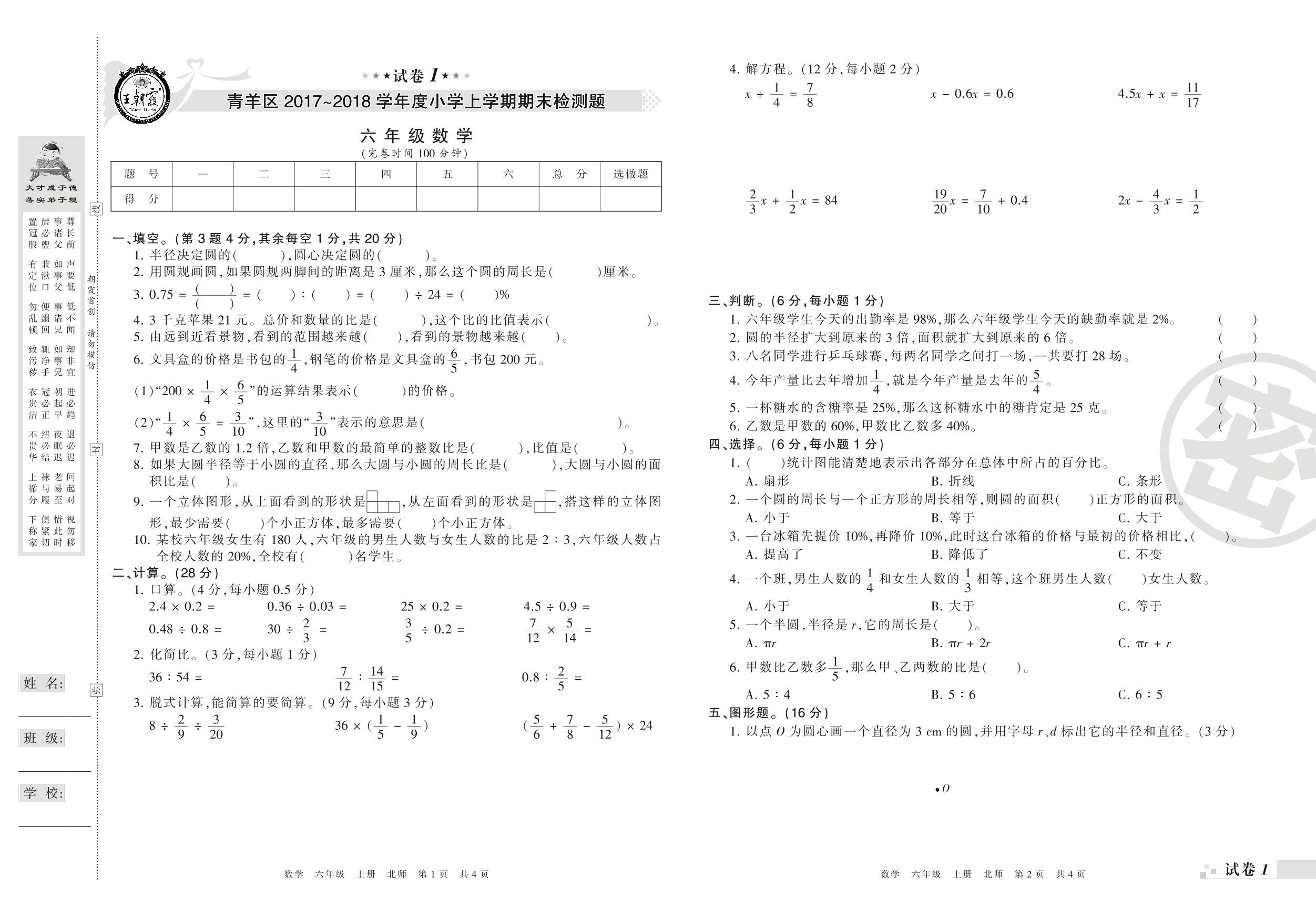 2017-2018学年第一学期成都市青羊区六年级数学试卷(北师版)【1】