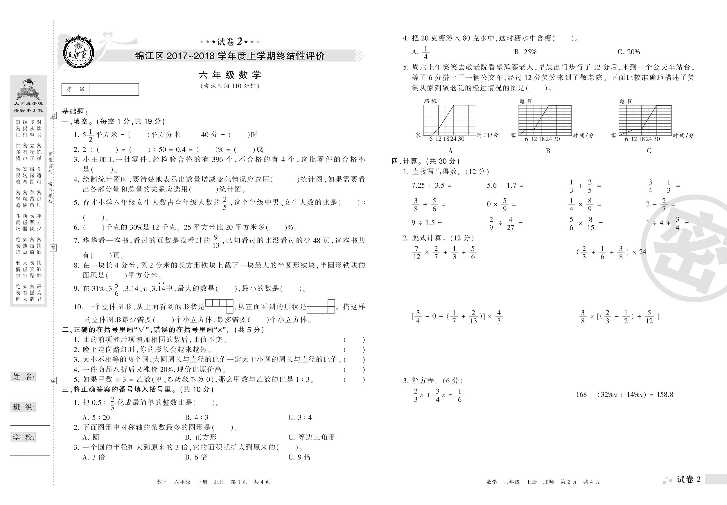 2017-2018学年第一学期成都市锦江区六年级数学试卷(北师版)【2】