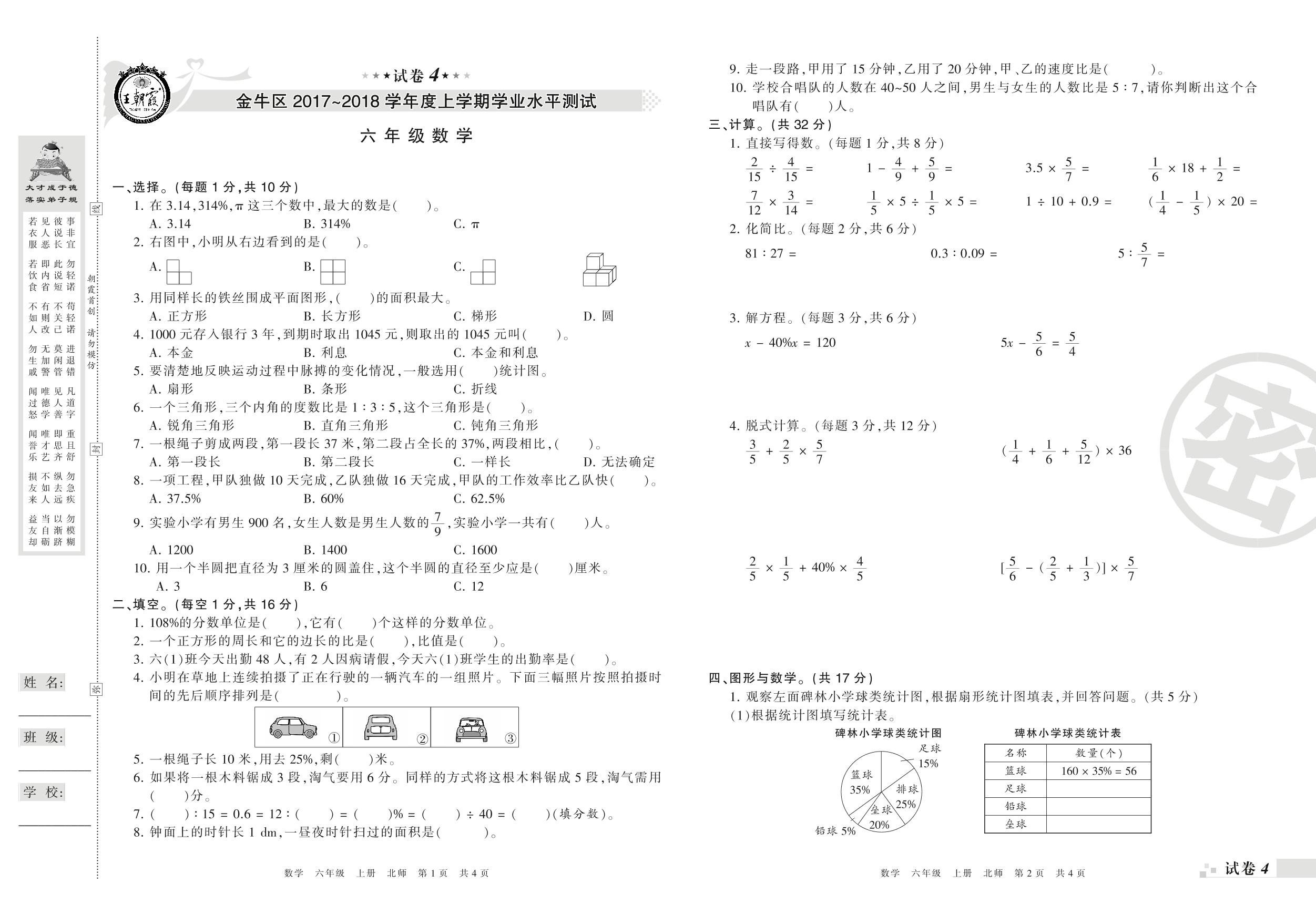2017-2018学年第一学期成都市金牛区六年级数学试卷(北师版)【4】