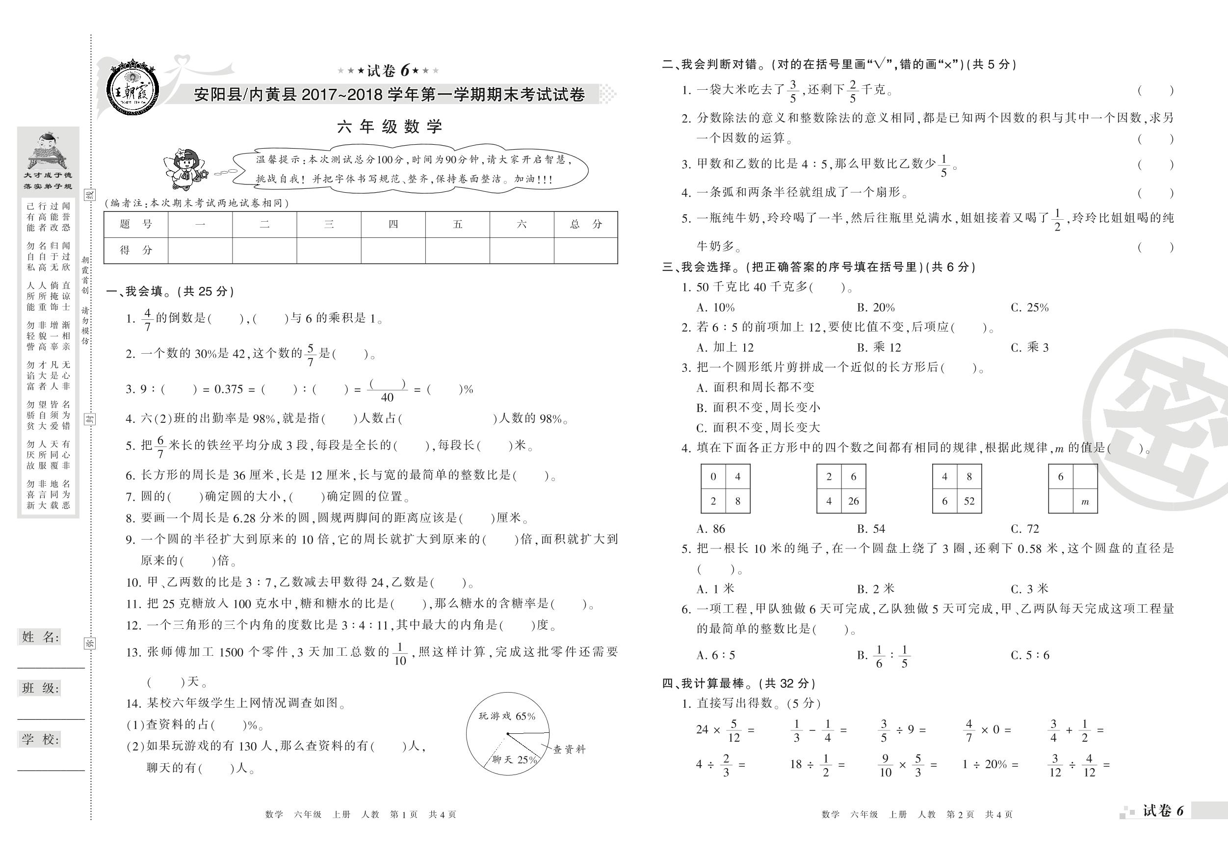 2017-2018学年第一学期安阳市、内黄县六年级数学试卷(人教版)【6】