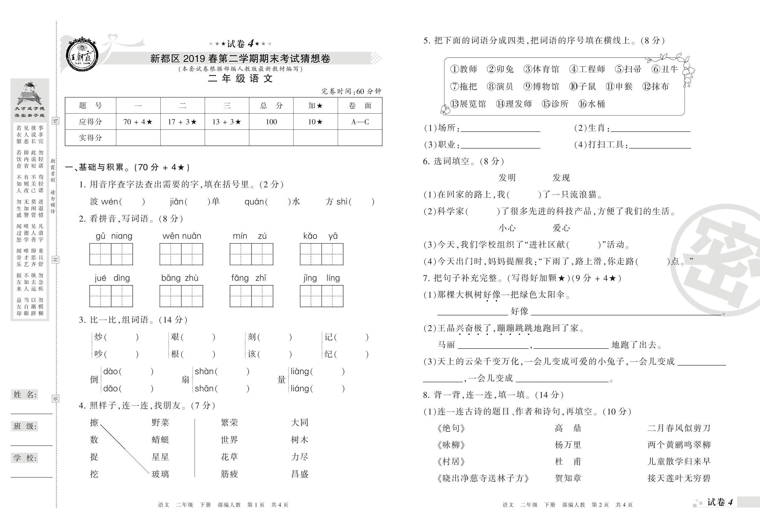 二年级语文人教版下册期末卷