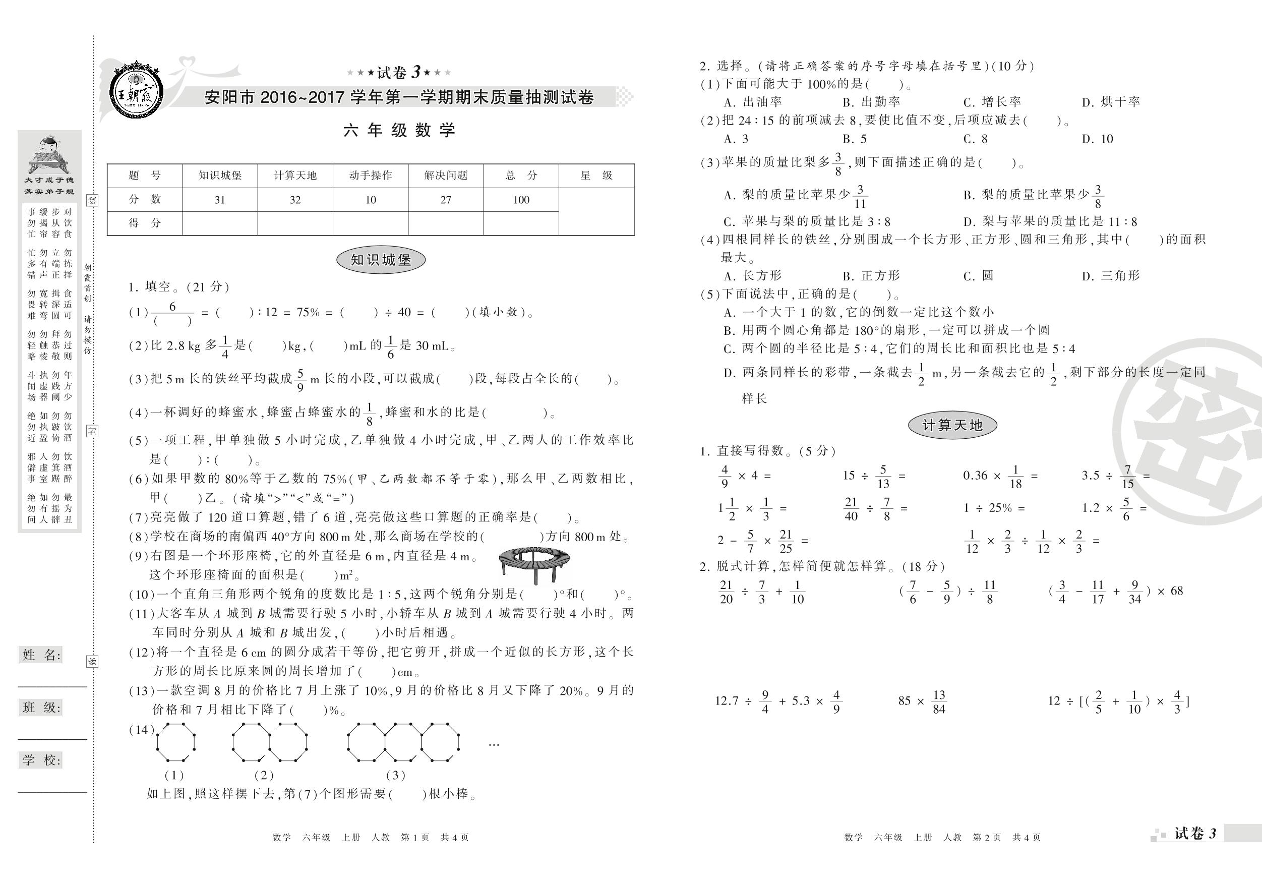 2016-2017学年第一学期安阳市六年级数学试卷(人教版)【3】