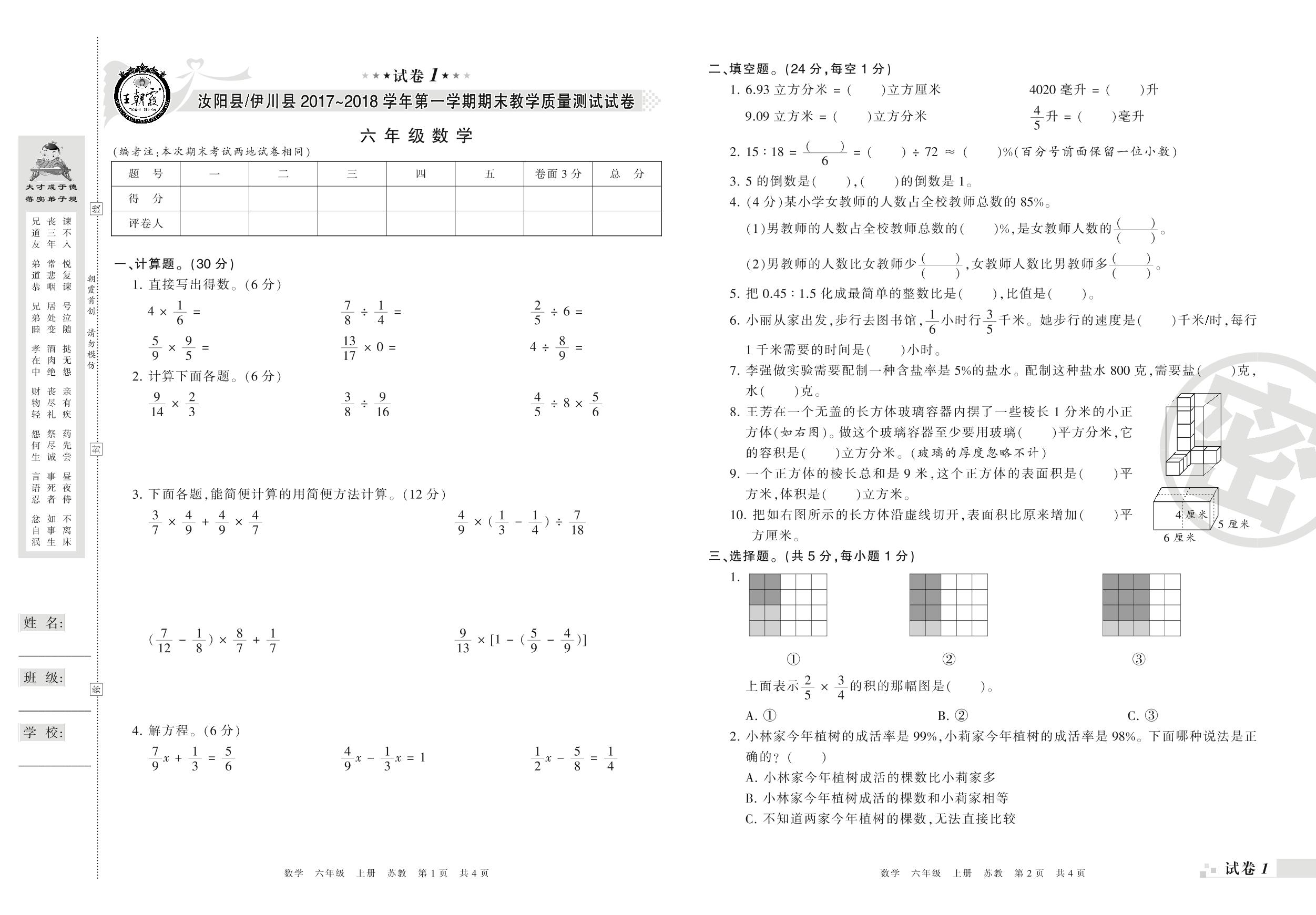 2017-2018学年第一学期洛阳市汝阳县、伊川县六年级数学试卷(苏教版)【1】