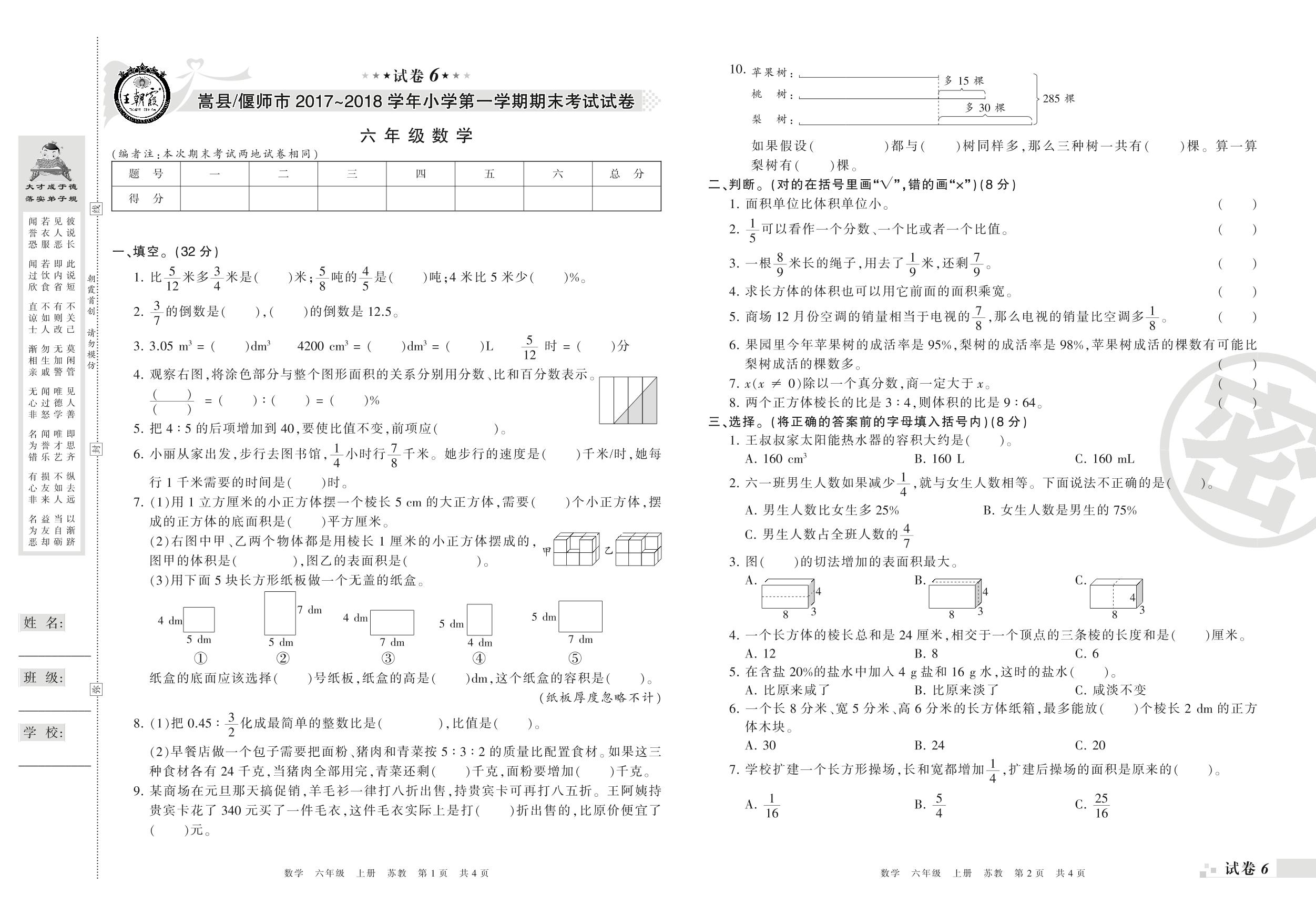 2017-2018学年第一学期嵩县、偃师市六年级数学试卷(苏教版)【6】