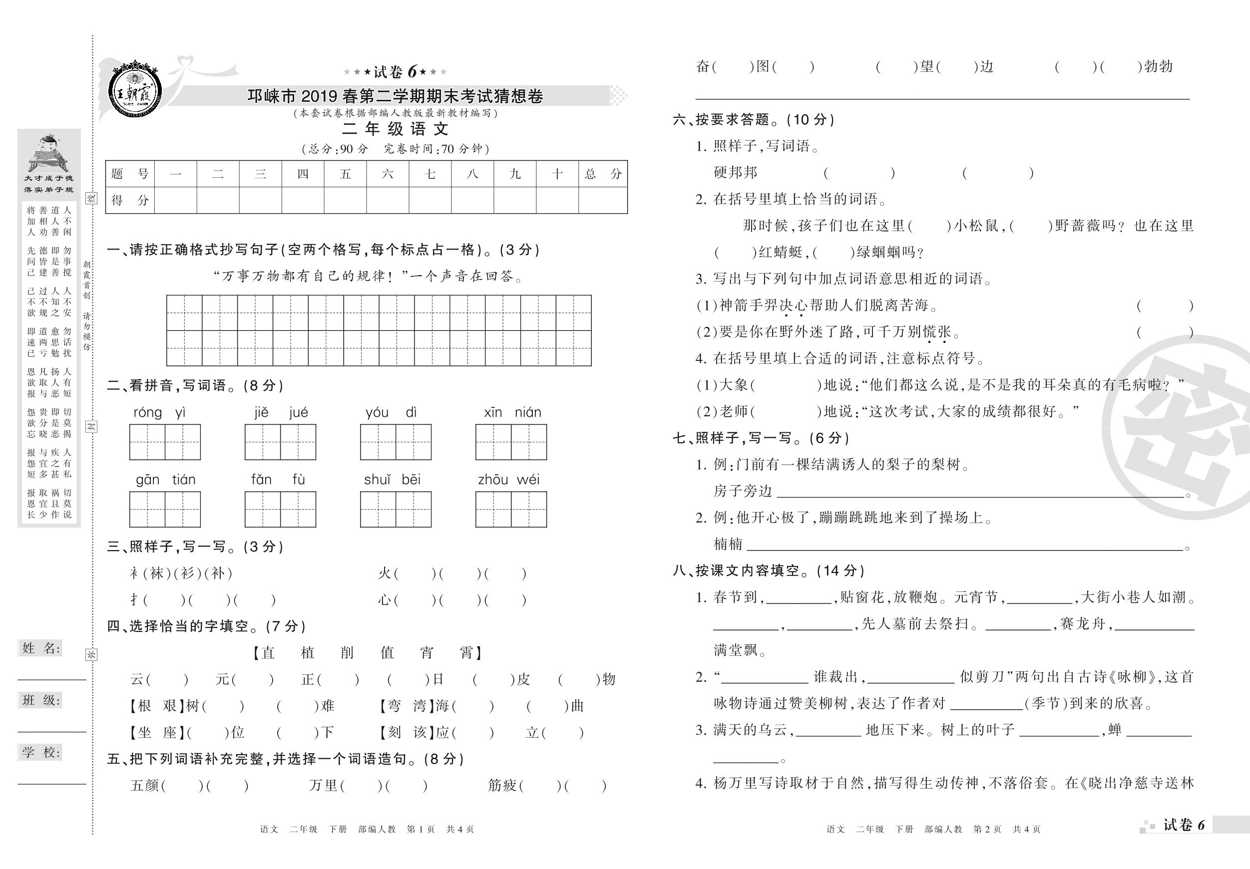 二年级语文人教版下册期末卷