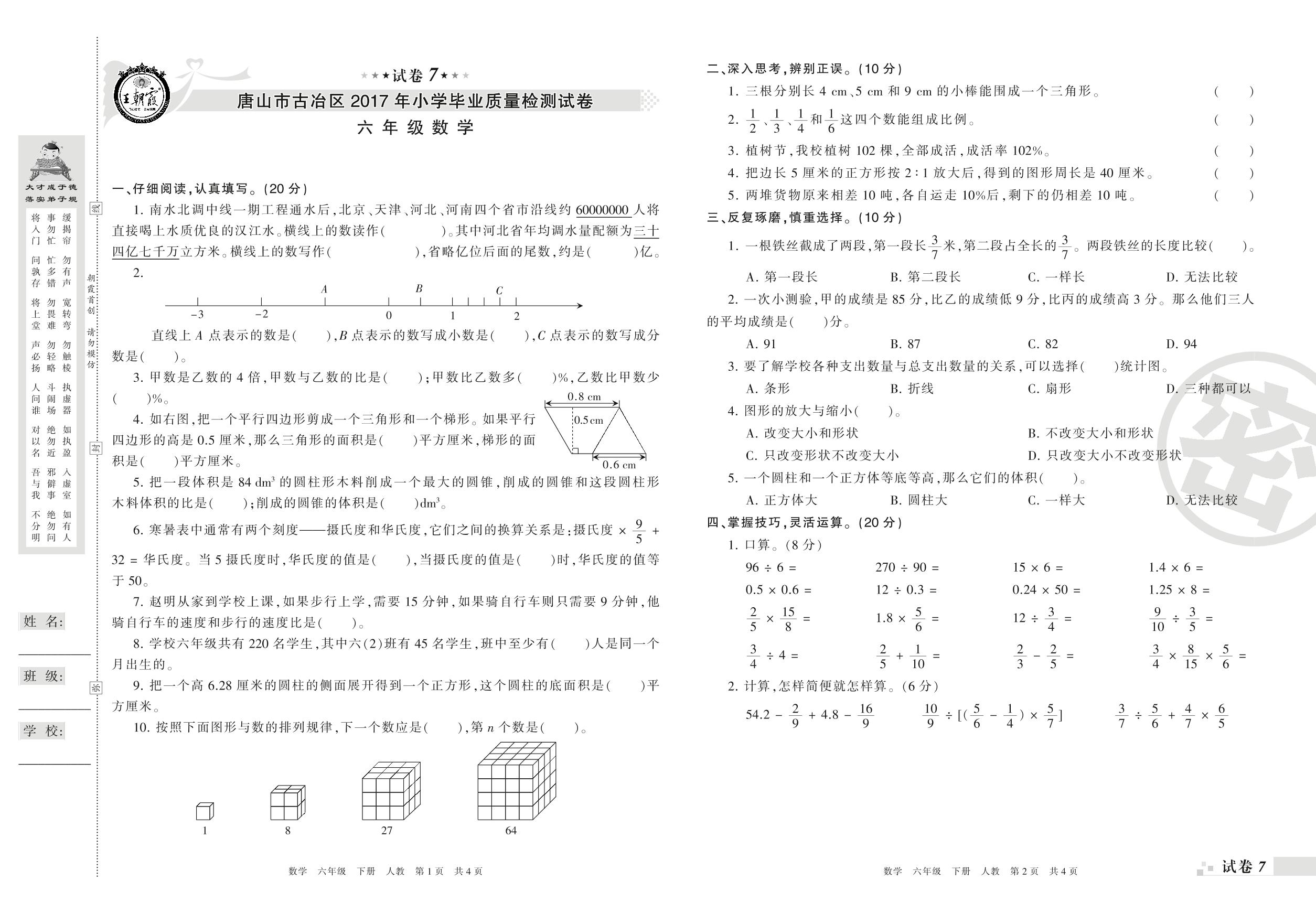 2016-2017学年第二学期唐山市古冶区六年级数学试卷(人教版)【7】