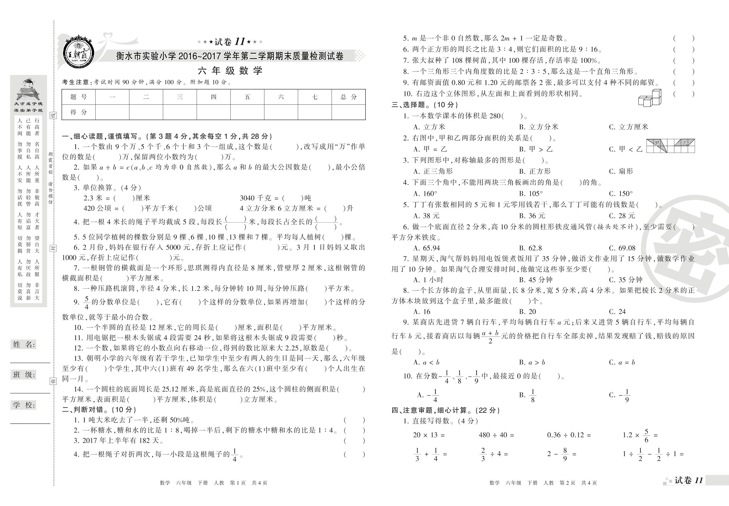 2016-2017学年第二学期衡水市实验小学六年级数学试卷(人教版)【11】