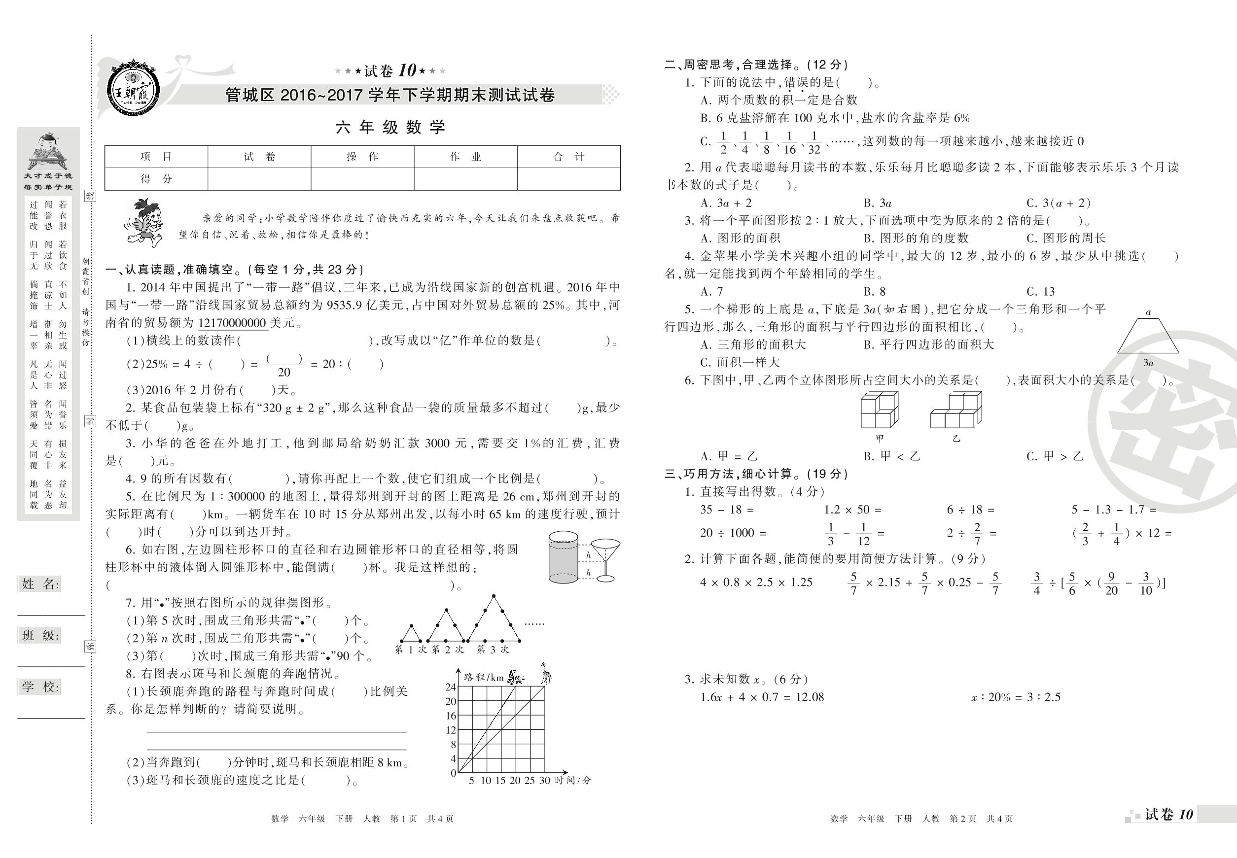 2016-2017学年第二学期郑州市管城区六年级数学试卷(人教版)【10】