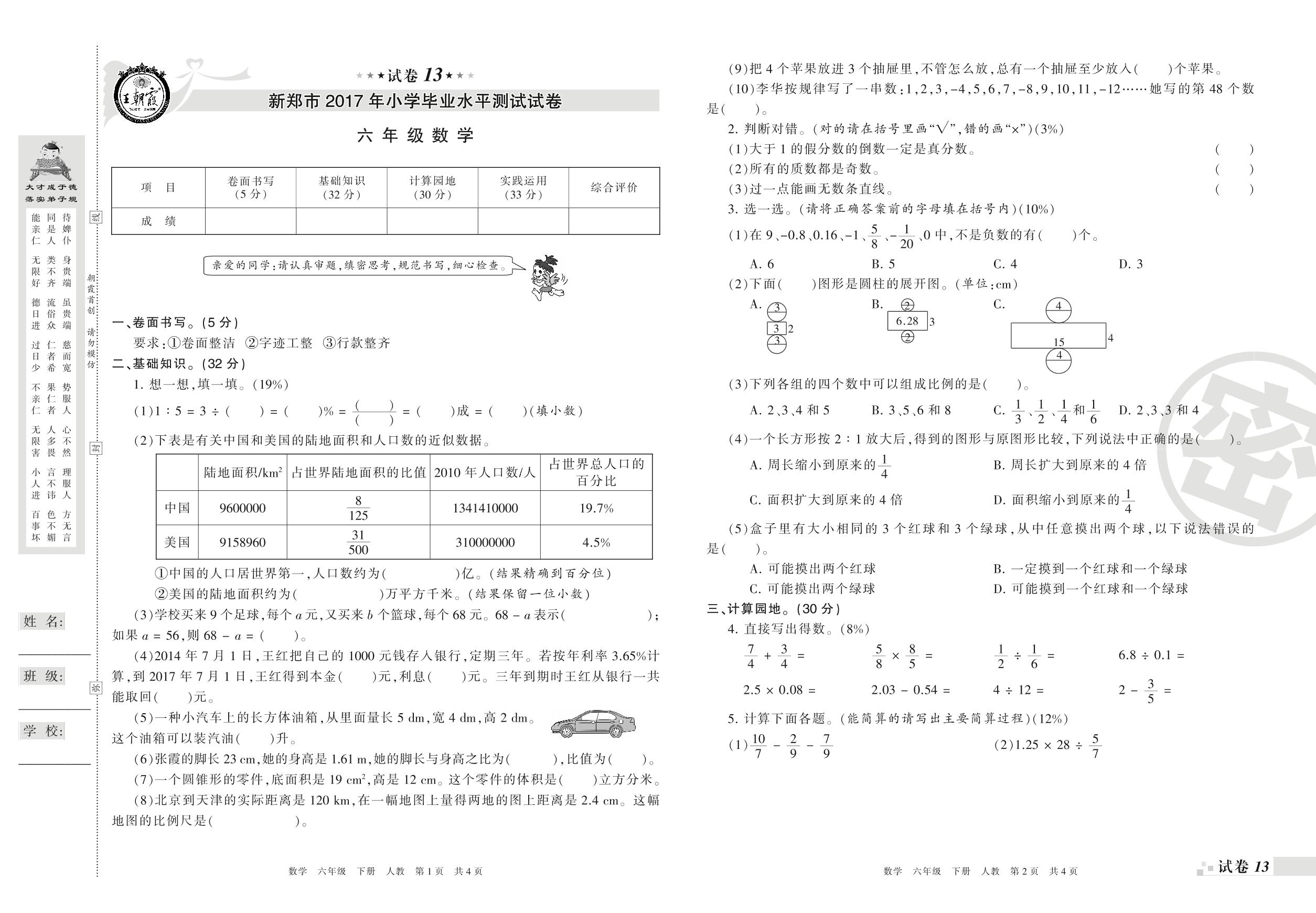 2016-2017学年第二学期新郑市六年级数学试卷(人教版)【13】