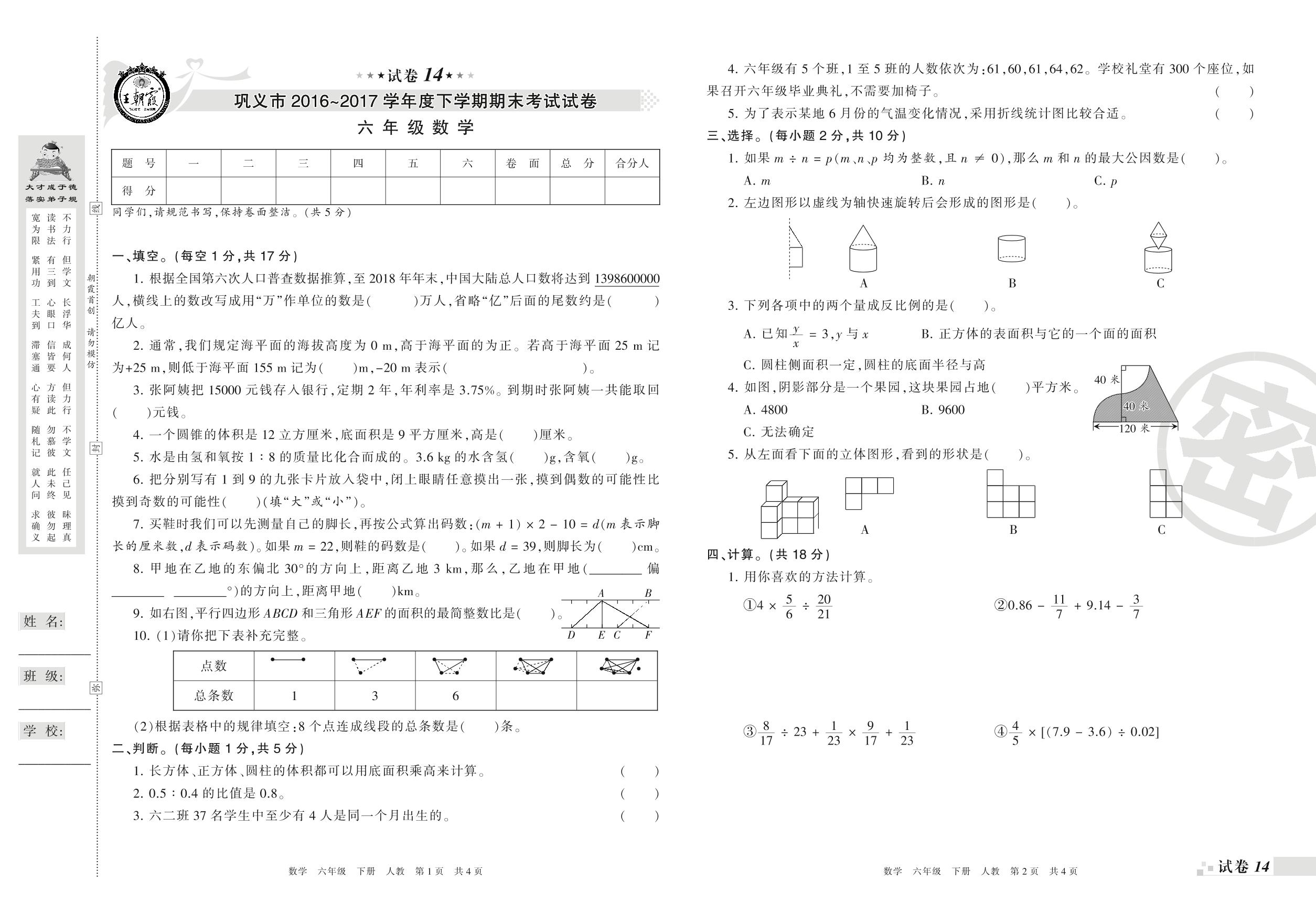 2016-2017学年第二学期巩义市六年级数学试卷(人教版)【14】
