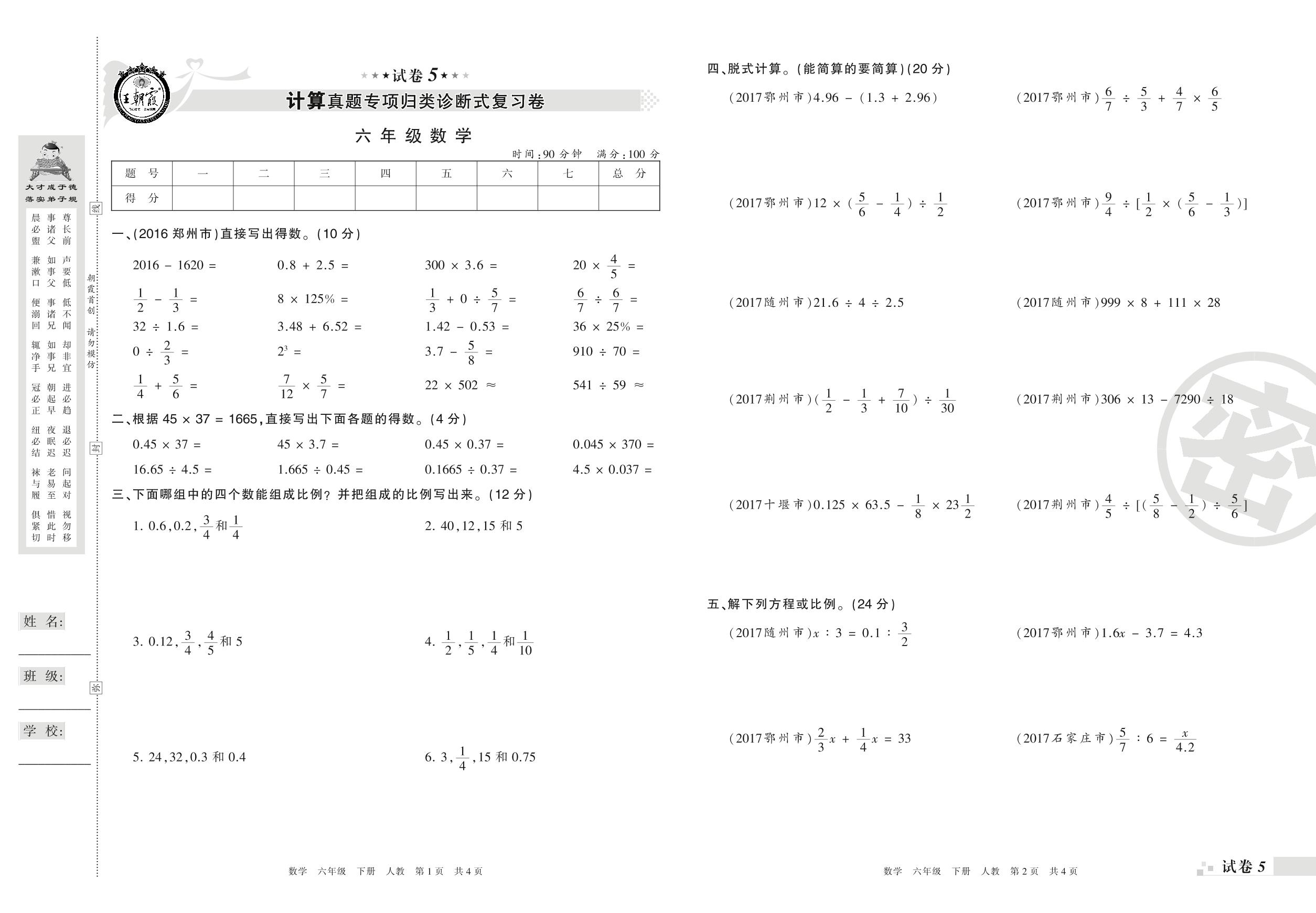 王朝霞期末专项卷——计算专项归类诊断式复习卷六年级下册数学(人教版)_R220125135922660【5】