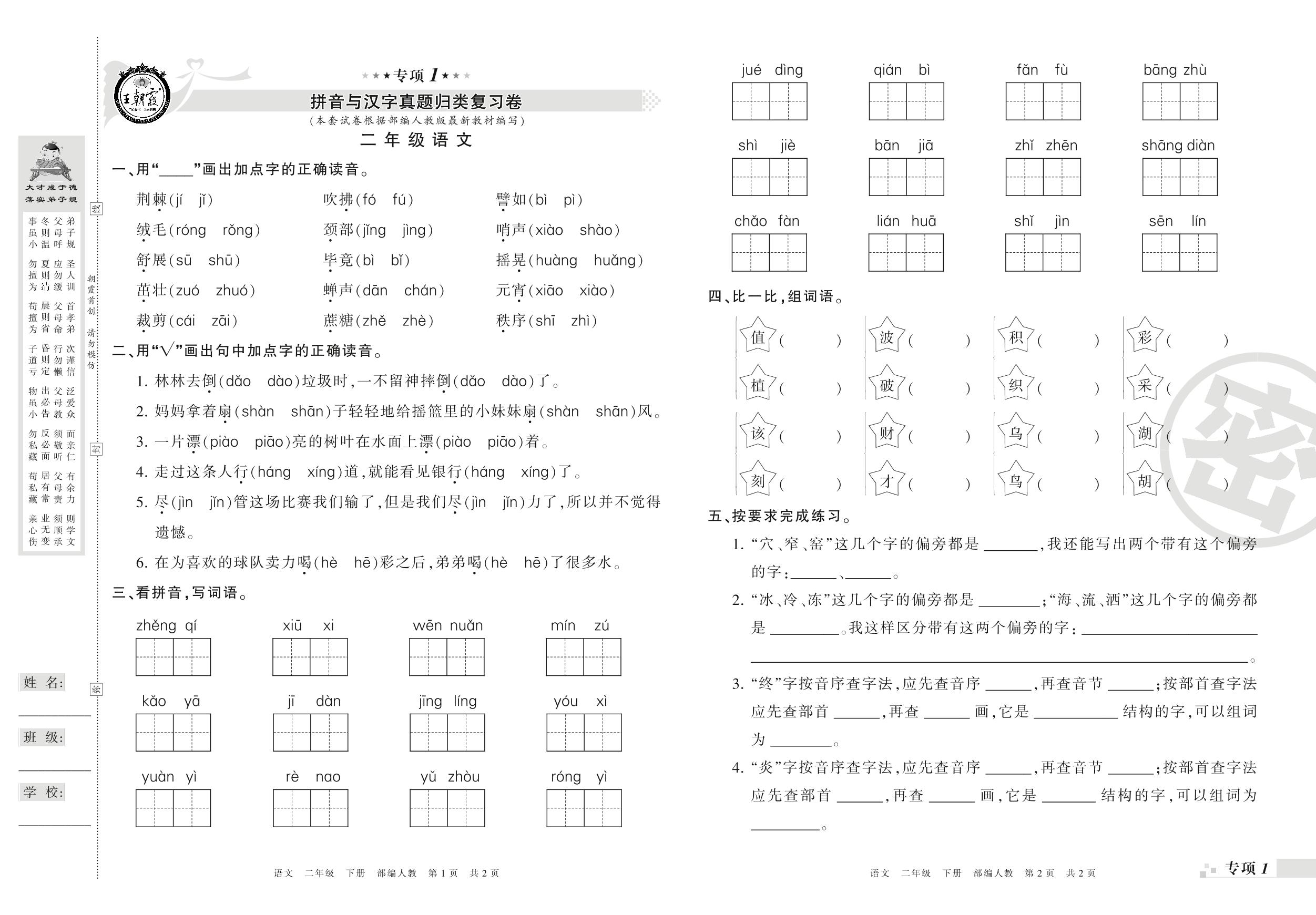 王朝霞期末专项卷——拼音与汉字、词语与句子真题归类复习二年级下册语文(人教版)_R21080173149【0】