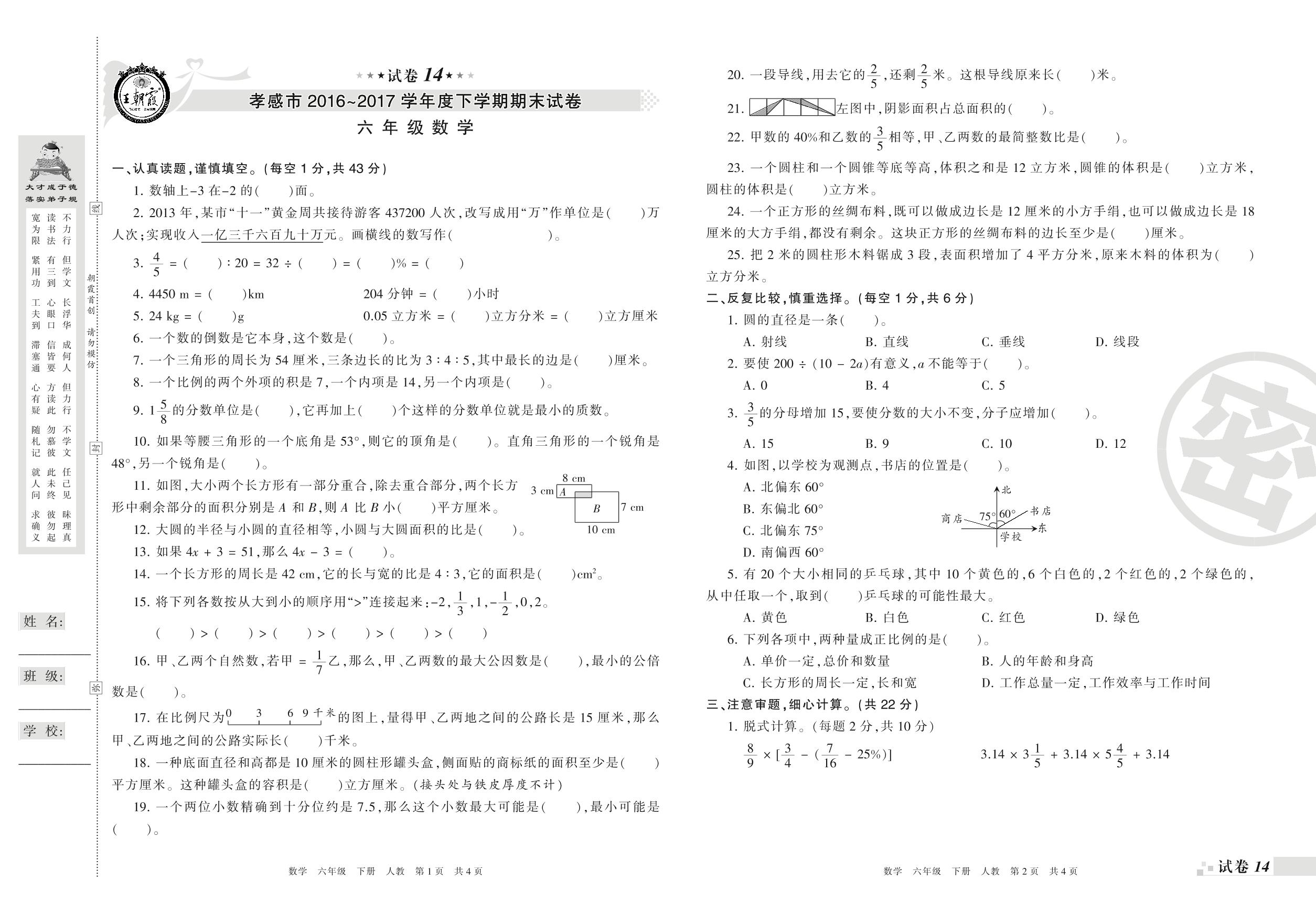 2016-2017学年第二学期孝感市六年级数学试卷(人教版)【14】
