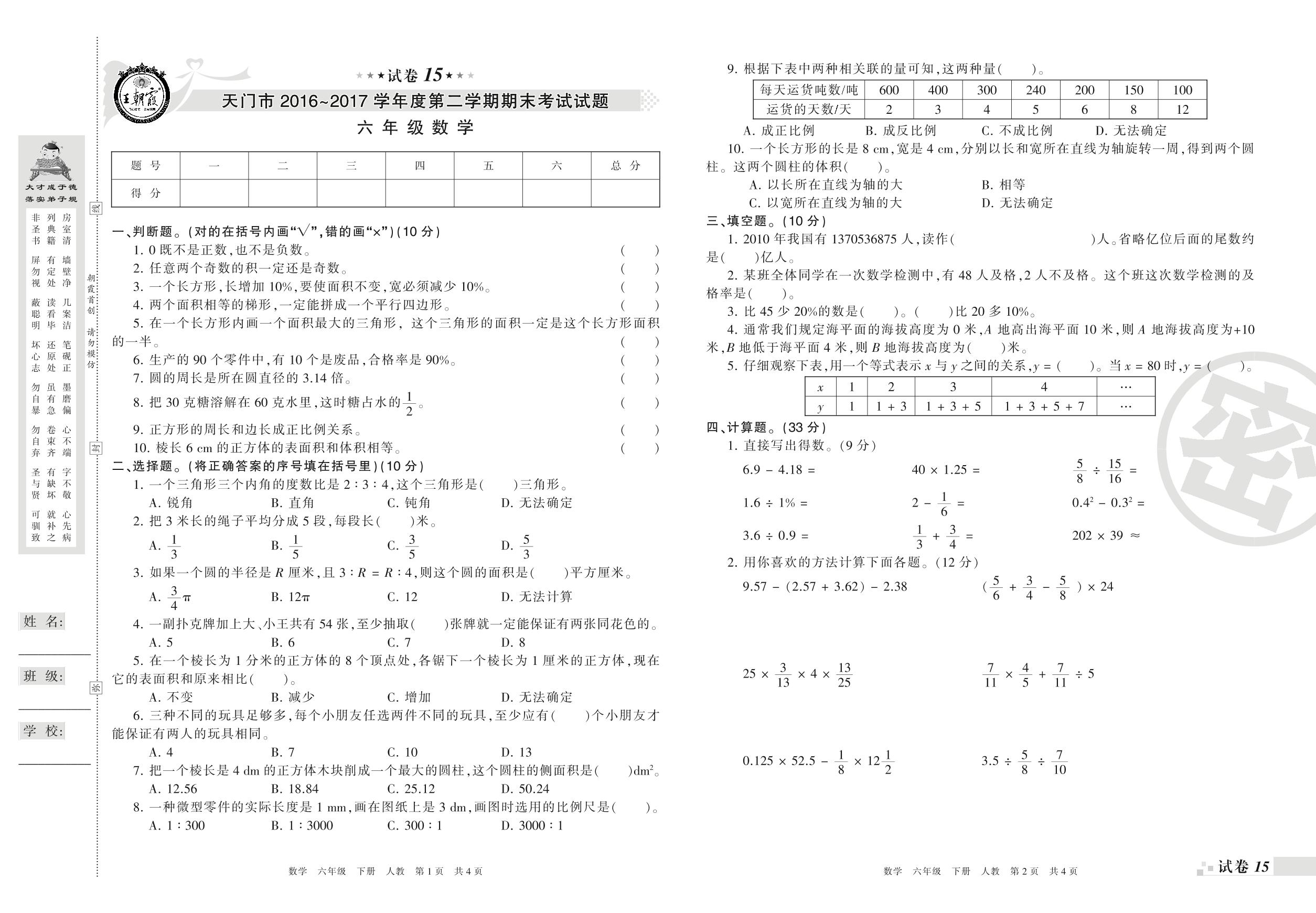 2016-2017学年第二学期天门市六年级数学试卷(人教版)【15】