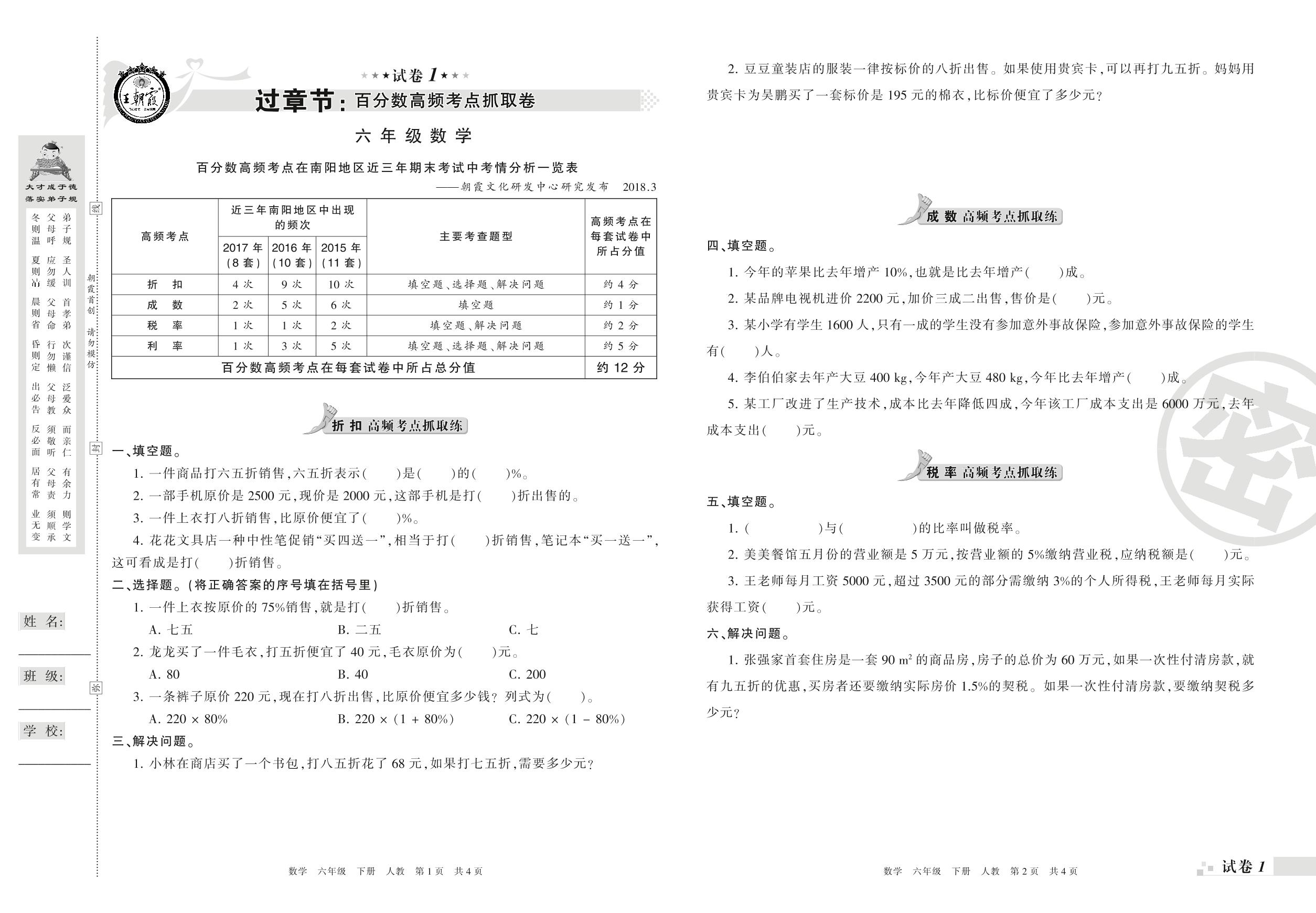 王朝霞期末过章节:百分数高频考点抓取卷六年级下册数学(人教版)_R210805114748【1】
