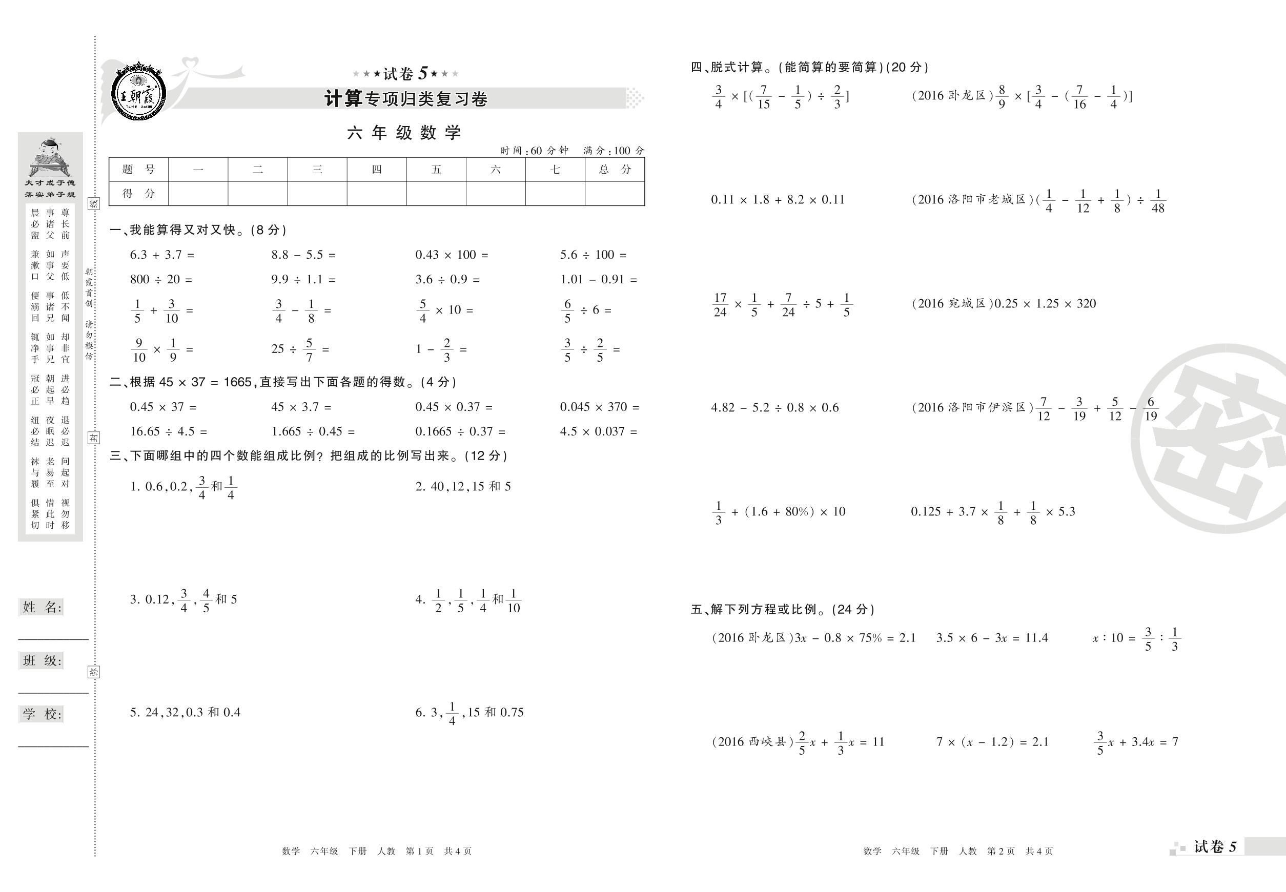 王朝霞期末专项卷——计算专项归类诊断式复习卷六年级下册数学(人教版)_R210805114807【5】