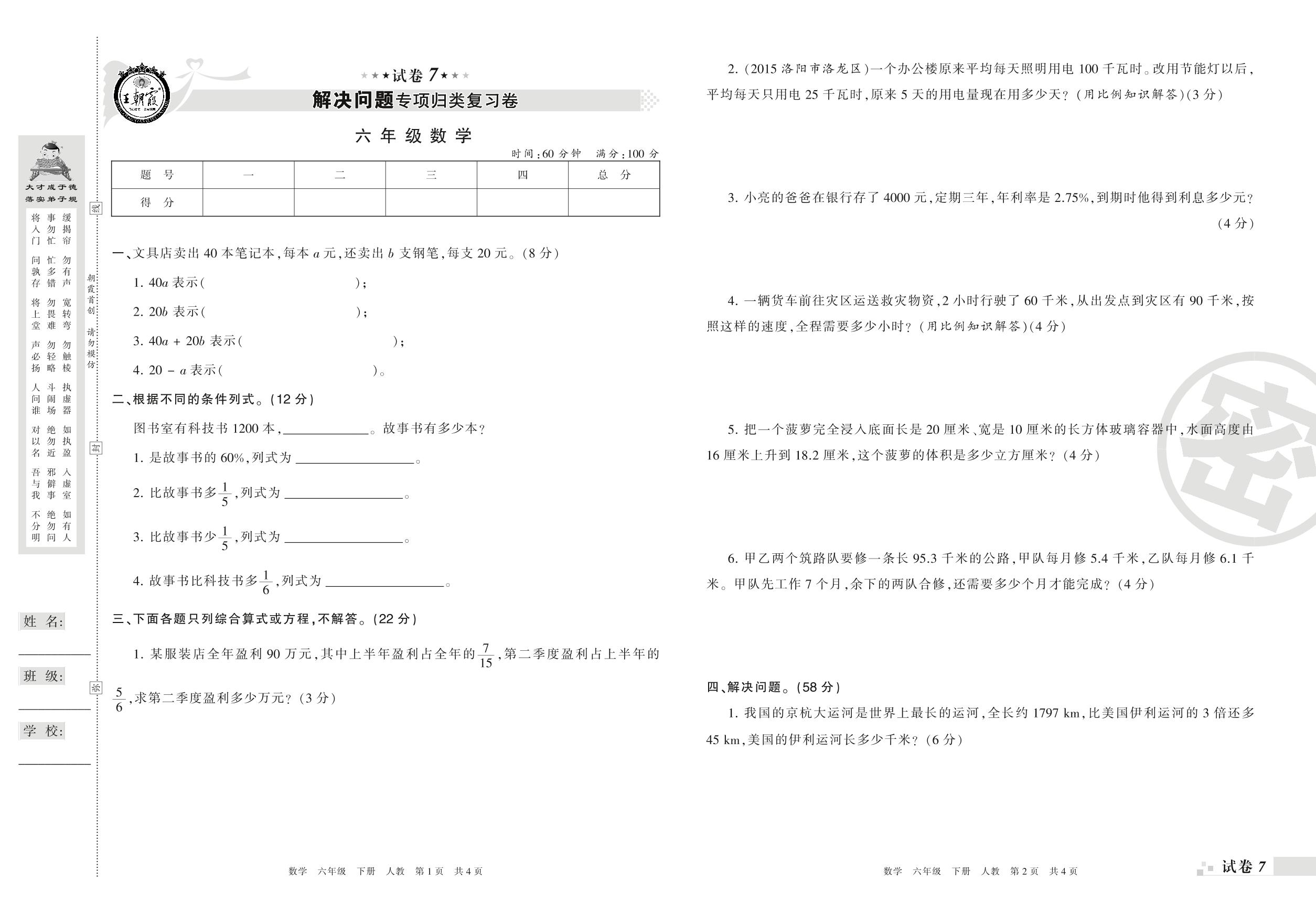 王朝霞期末专项卷——解决问题专项归类诊断式复习卷六年级下册数学(人教版)_R210805114813【7】
