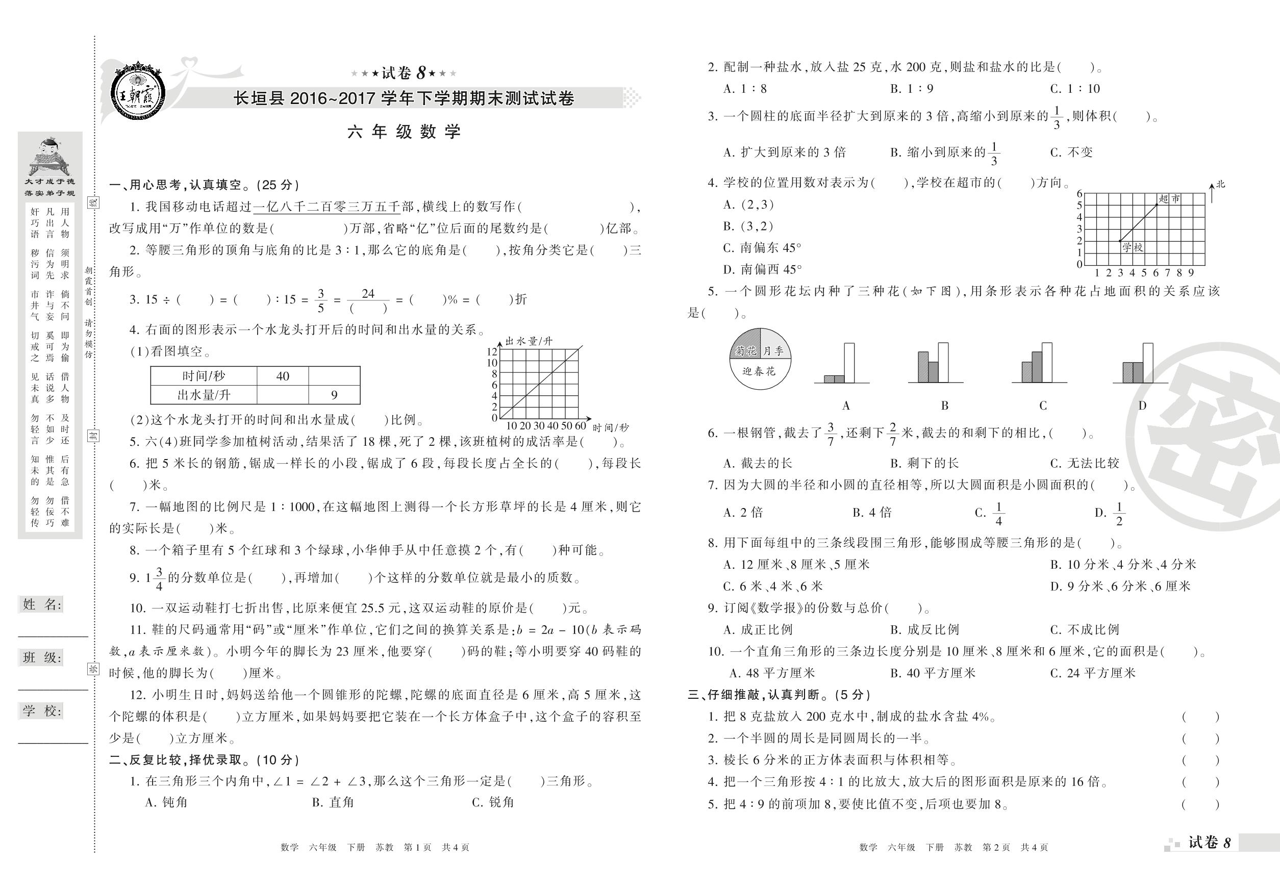 2016-2017学年第二学期新乡市长垣县六年级数学试卷(苏教版)【8】