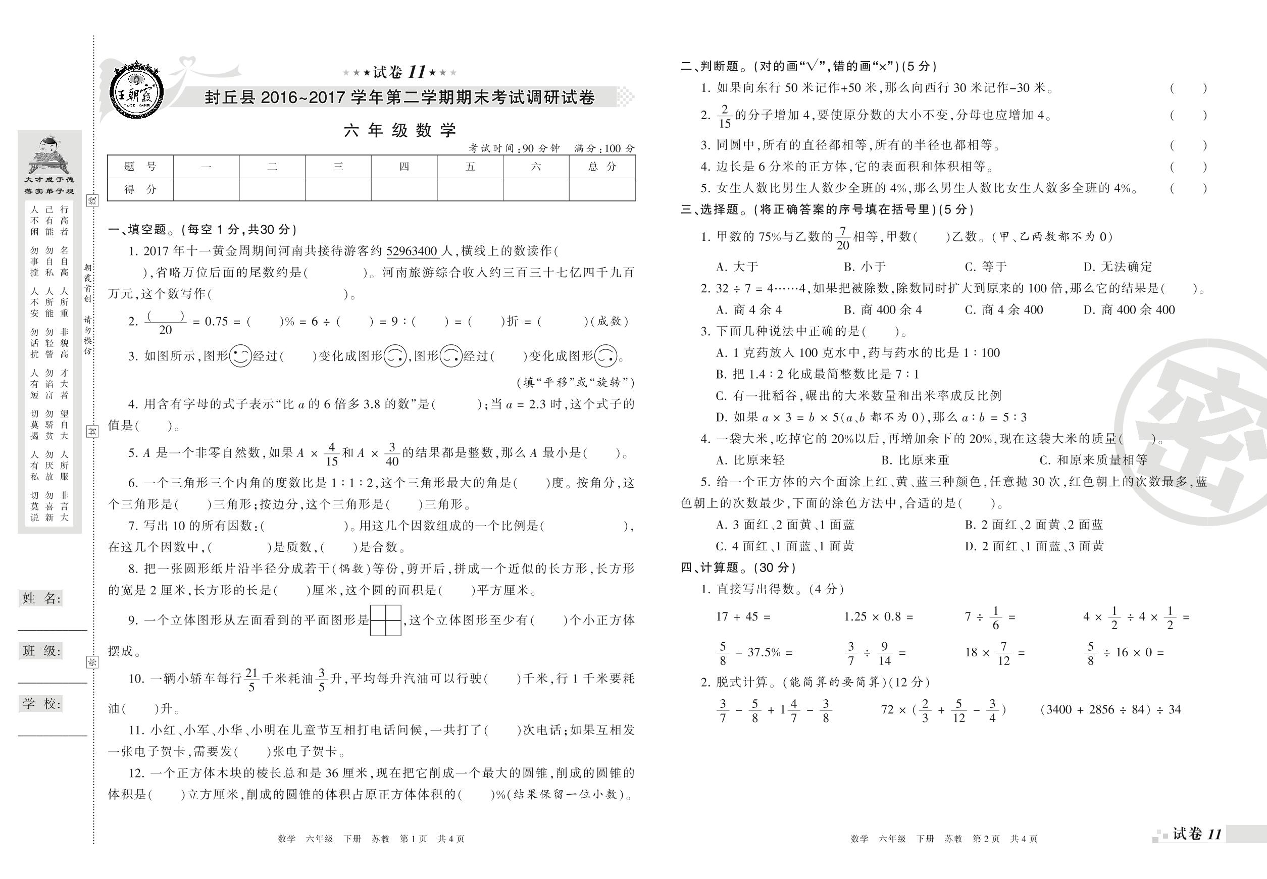 2016-2017学年第二学期新乡市封丘县六年级数学试卷(苏教版)【11】