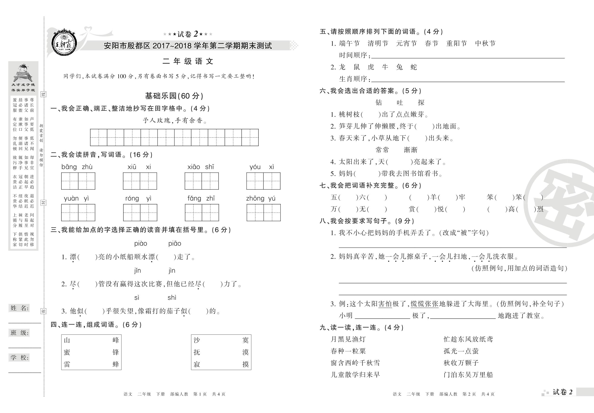2017-2018学年第二学期安阳市殷都区二年级语文试卷(人教版)【2】