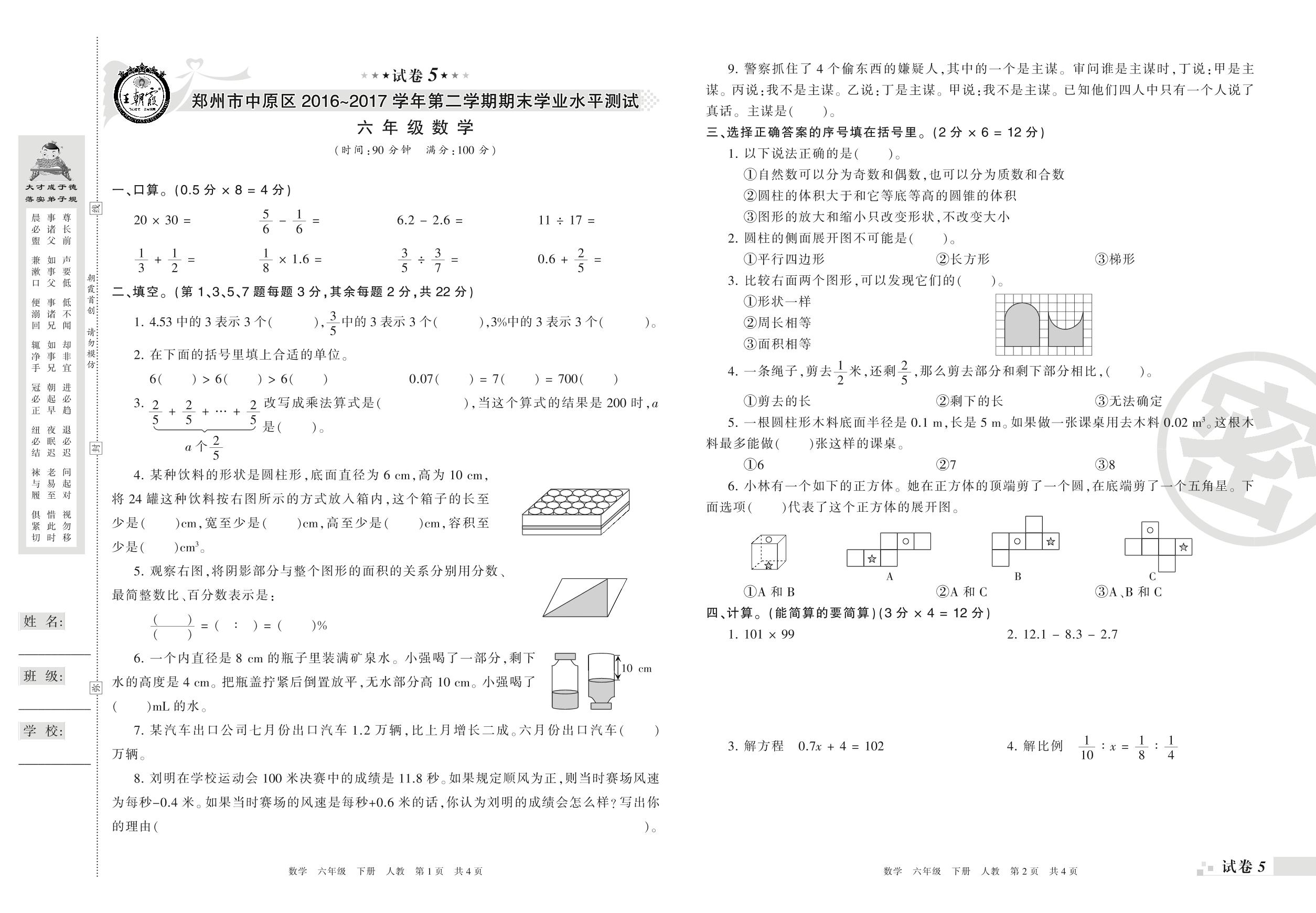 2016-2017学年第二学期郑州市中原区六年级数学试卷(人教版)【5】