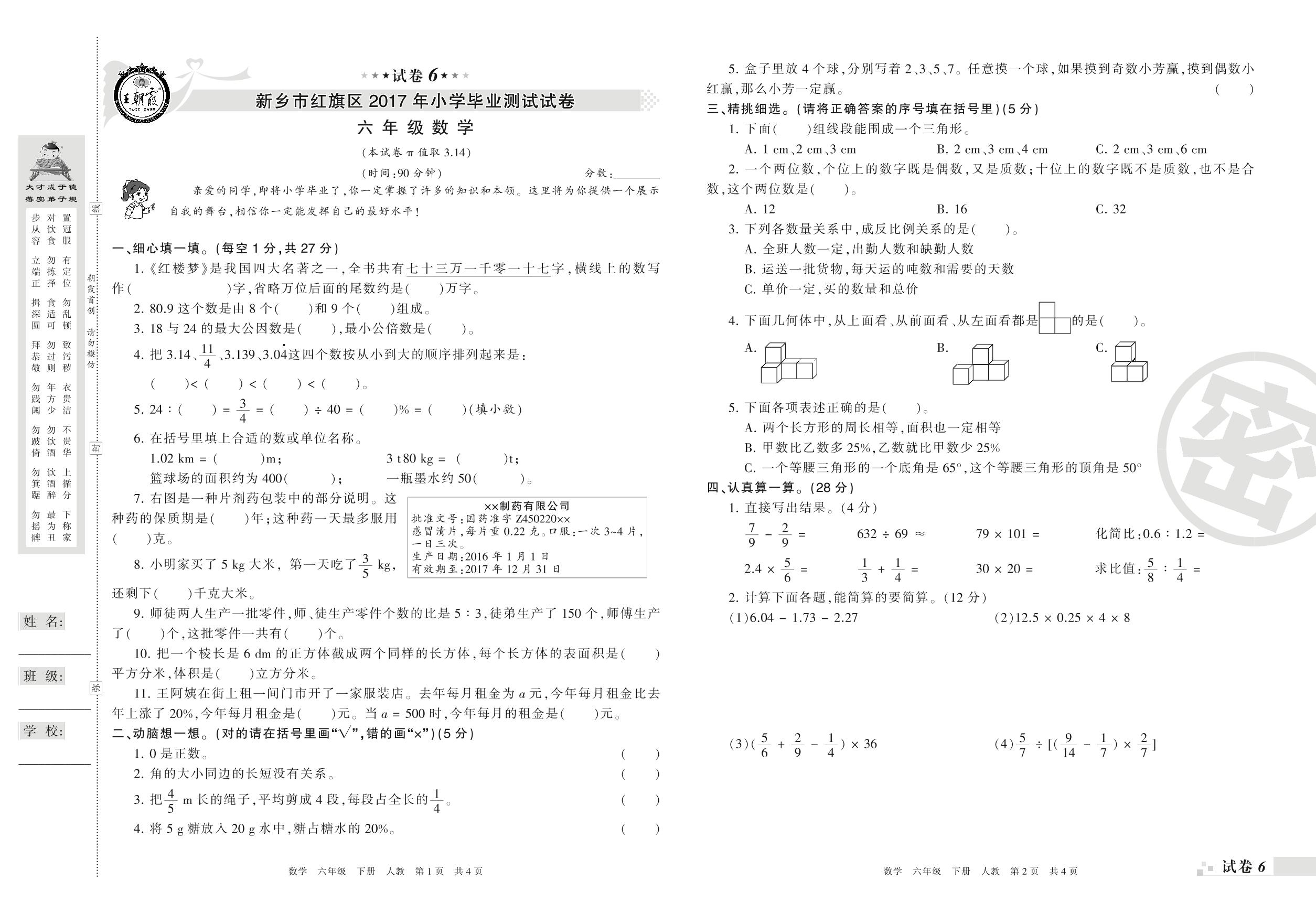 2016-2017学年第二学期新乡市红旗区六年级数学试卷(人教版)【6】