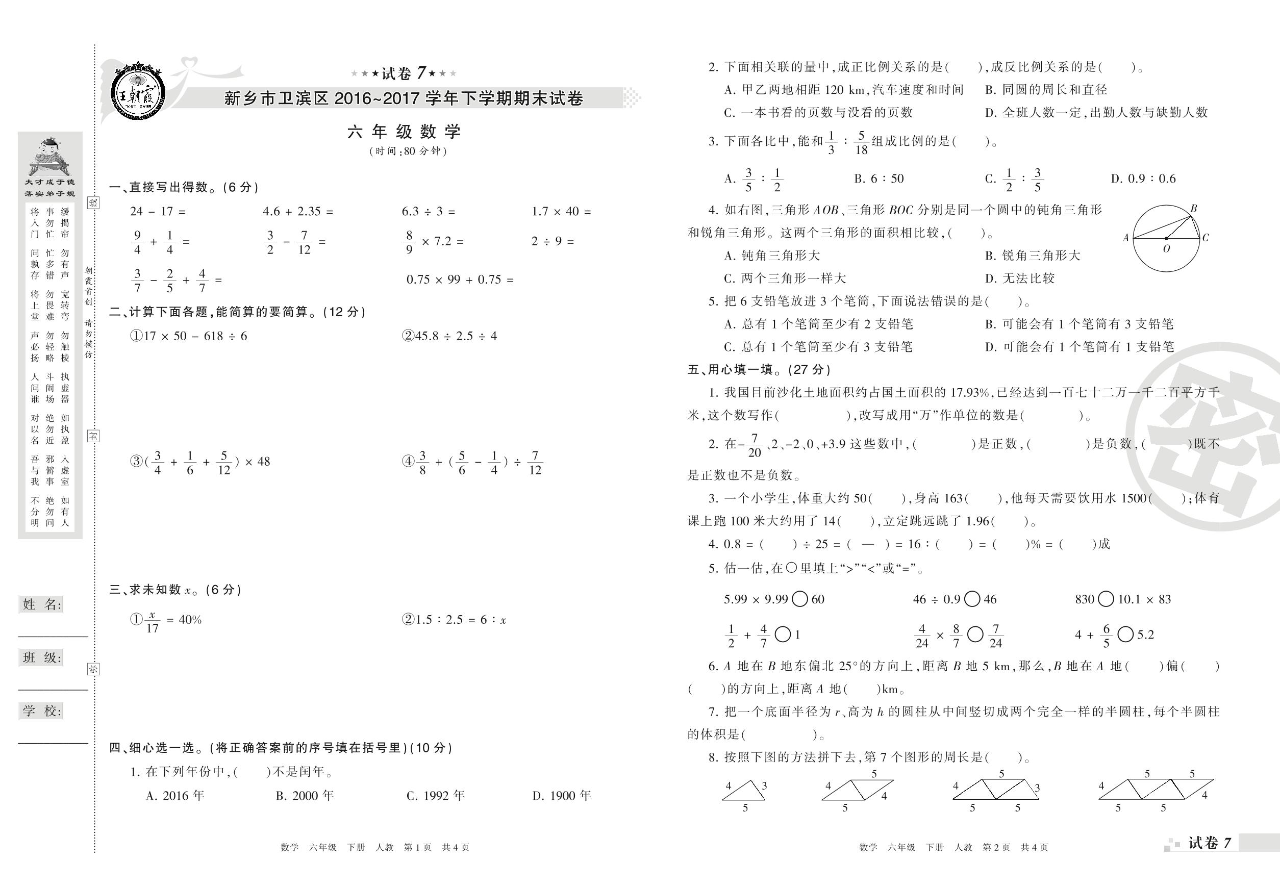 2016-2017学年第二学期新乡市卫滨区六年级数学试卷(人教版)【7】