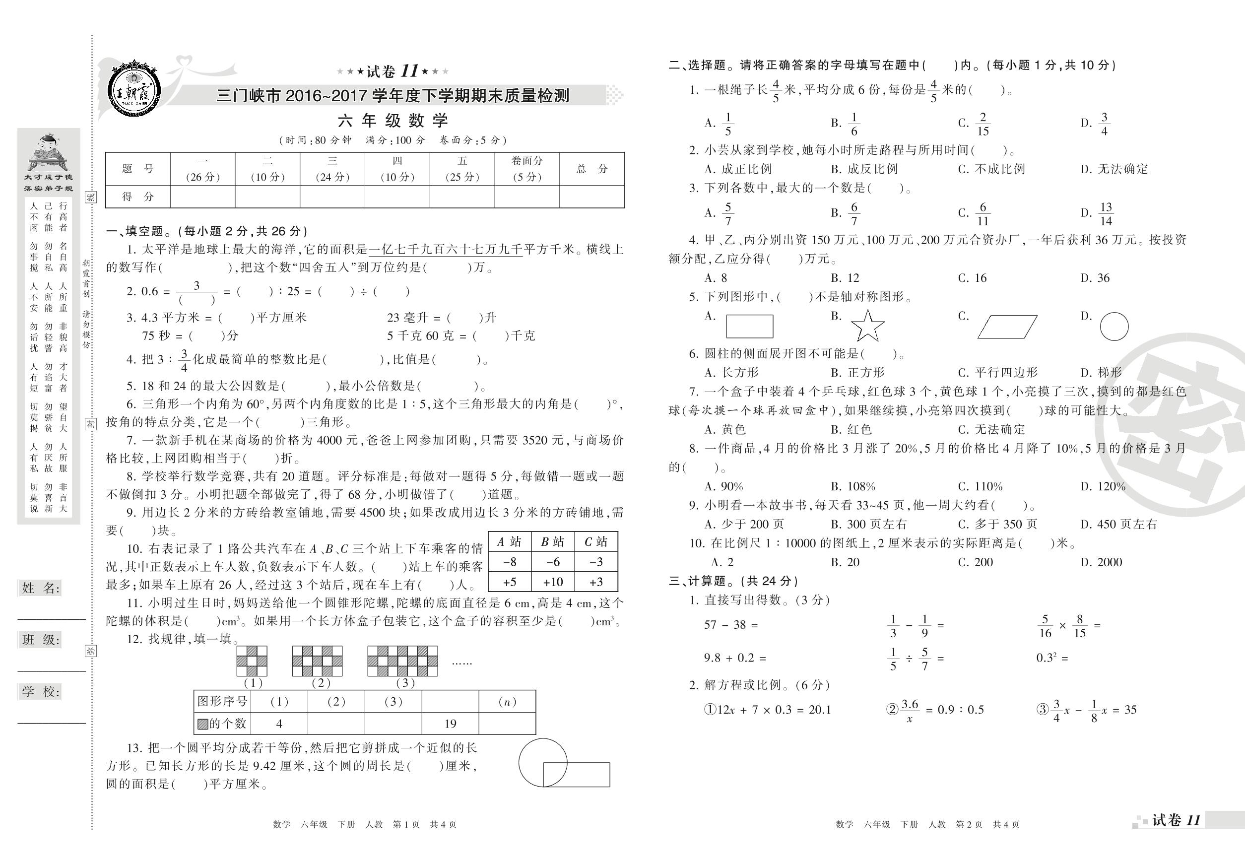 2016-2017学年第二学期三门峡市六年级数学试卷(人教版)【11】