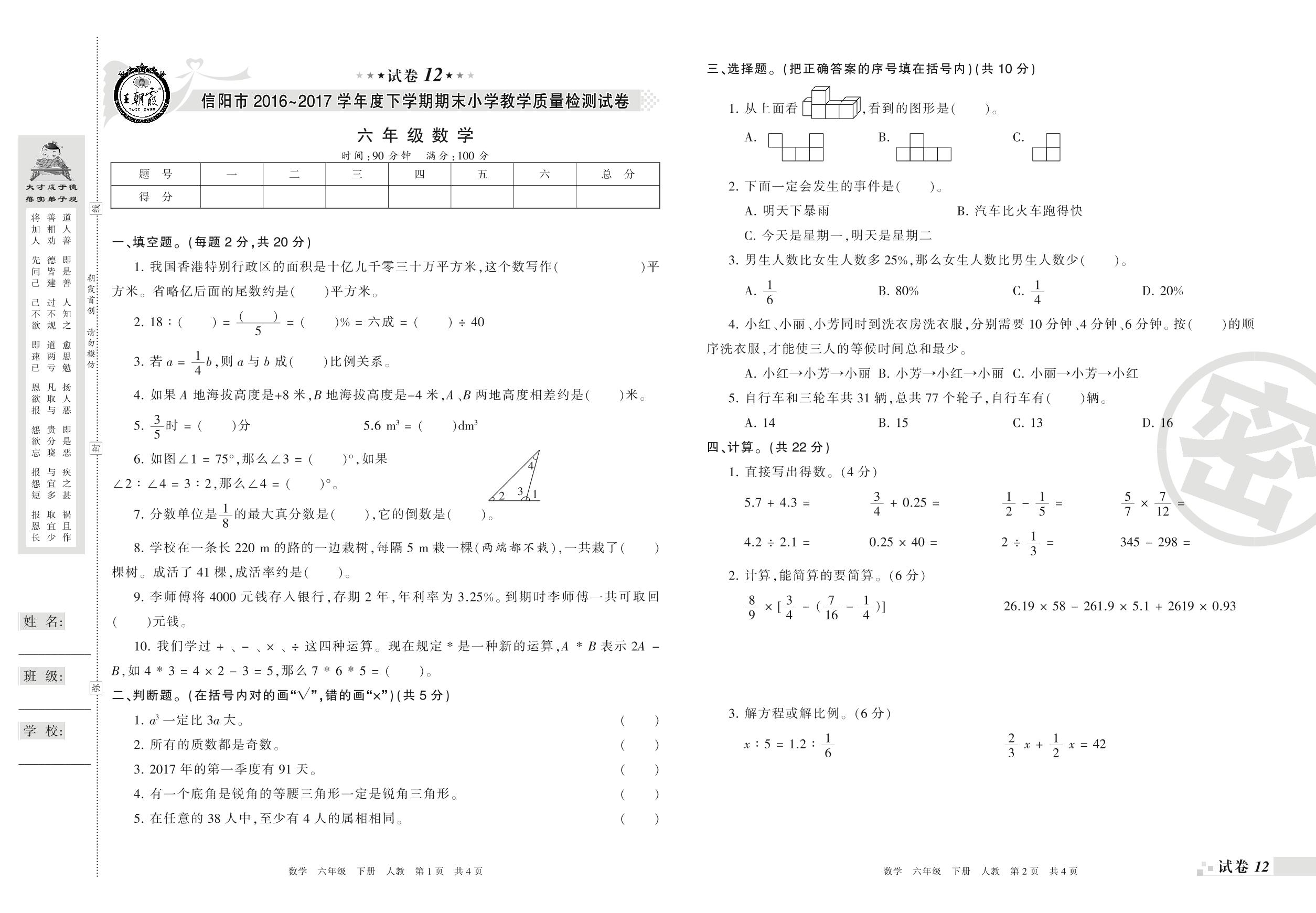 2016-2017学年第二学期信阳市六年级数学试卷(人教版)【12】