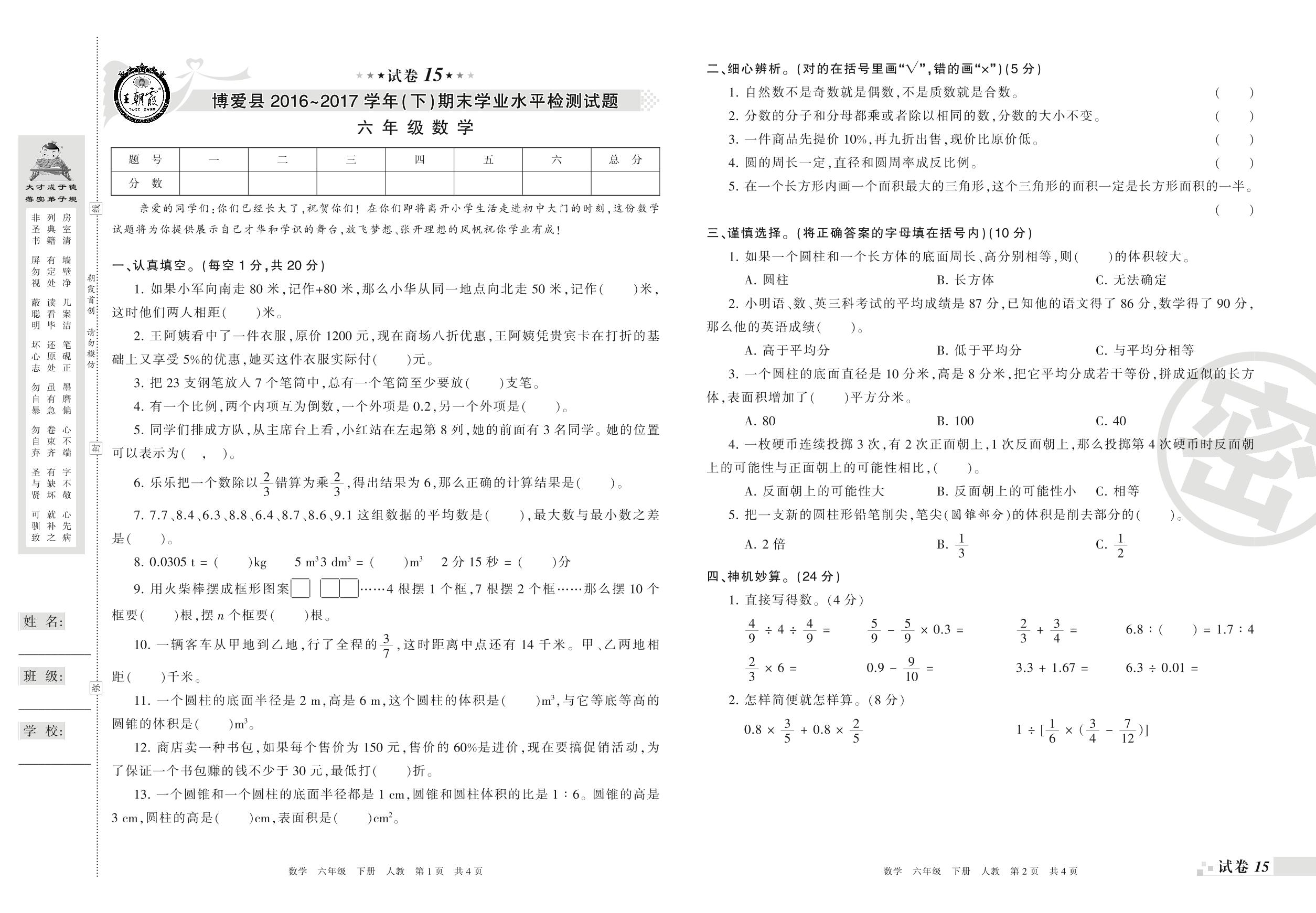 2016-2017学年第二学期焦作市博爱县六年级数学试卷(人教版)【15】