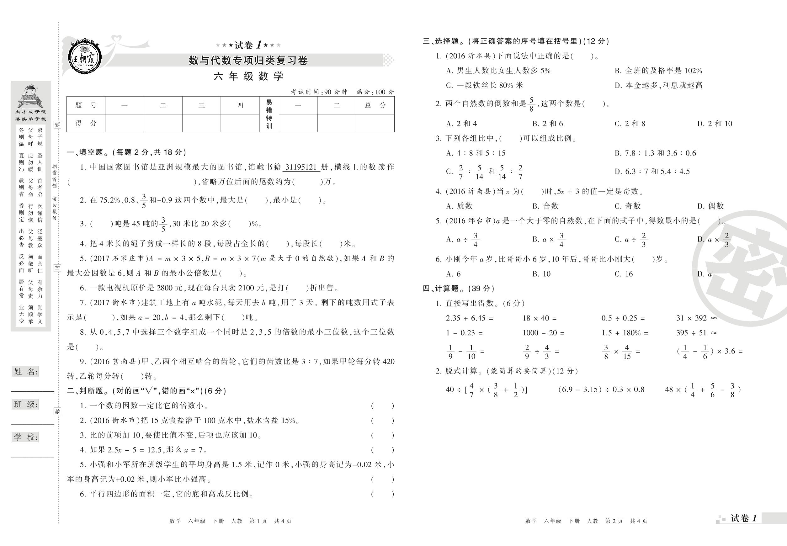 王朝霞期末专项卷——数与代数专项归类复习卷六年级下册数学(人教版)_R210805115012【1】