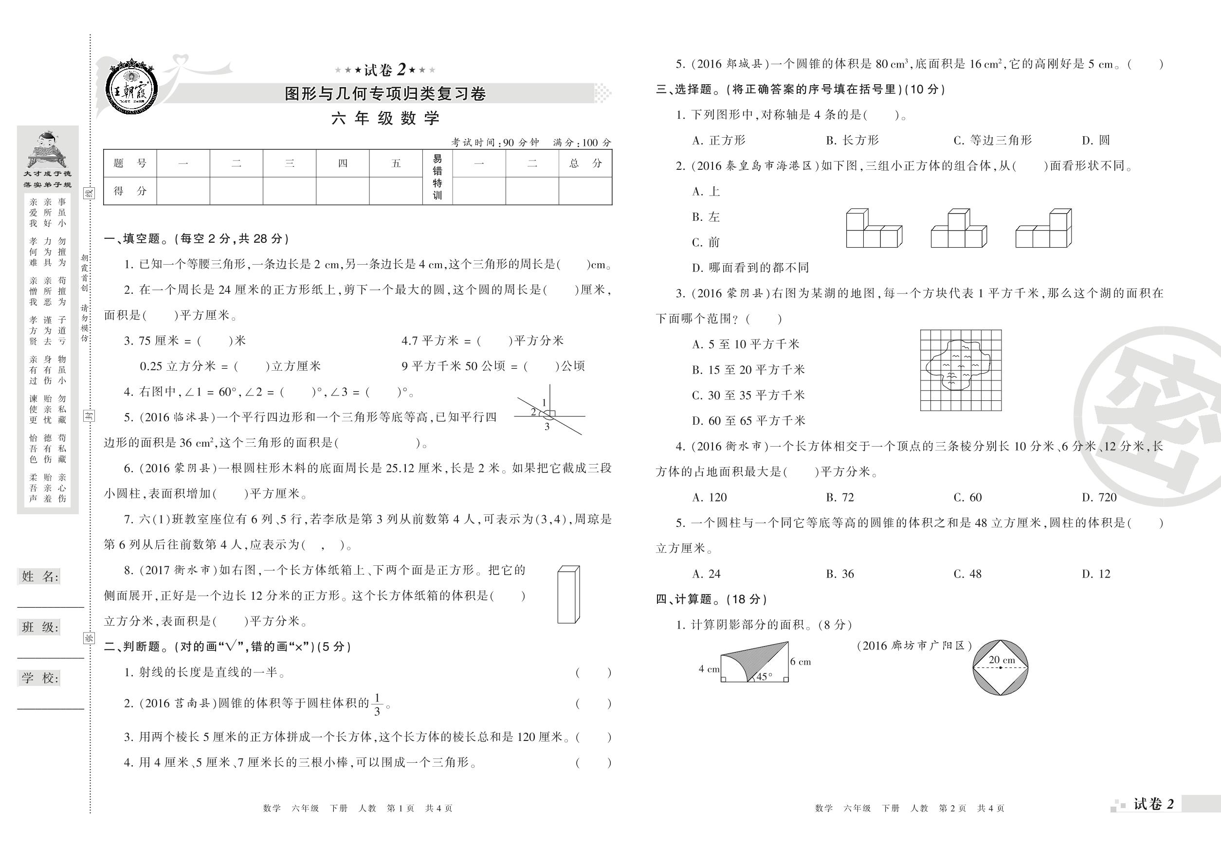 王朝霞期末专项卷——图形与几何专项归类复习卷六年级下册数学(人教版)_R210805115014【2】
