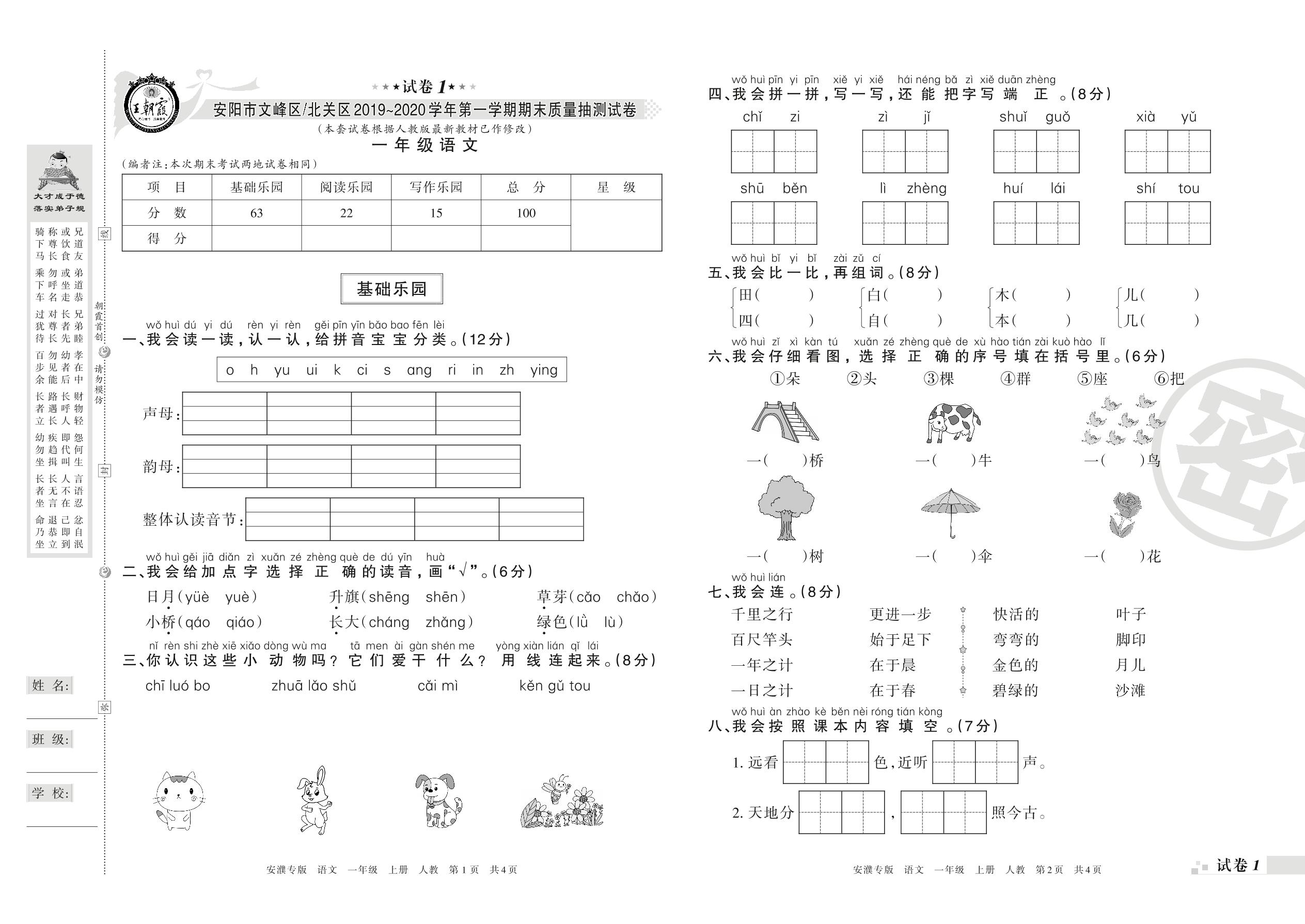 2019-2020学年第一学期安阳市文峰区、北关区一年级语文试卷(人教版)【1】