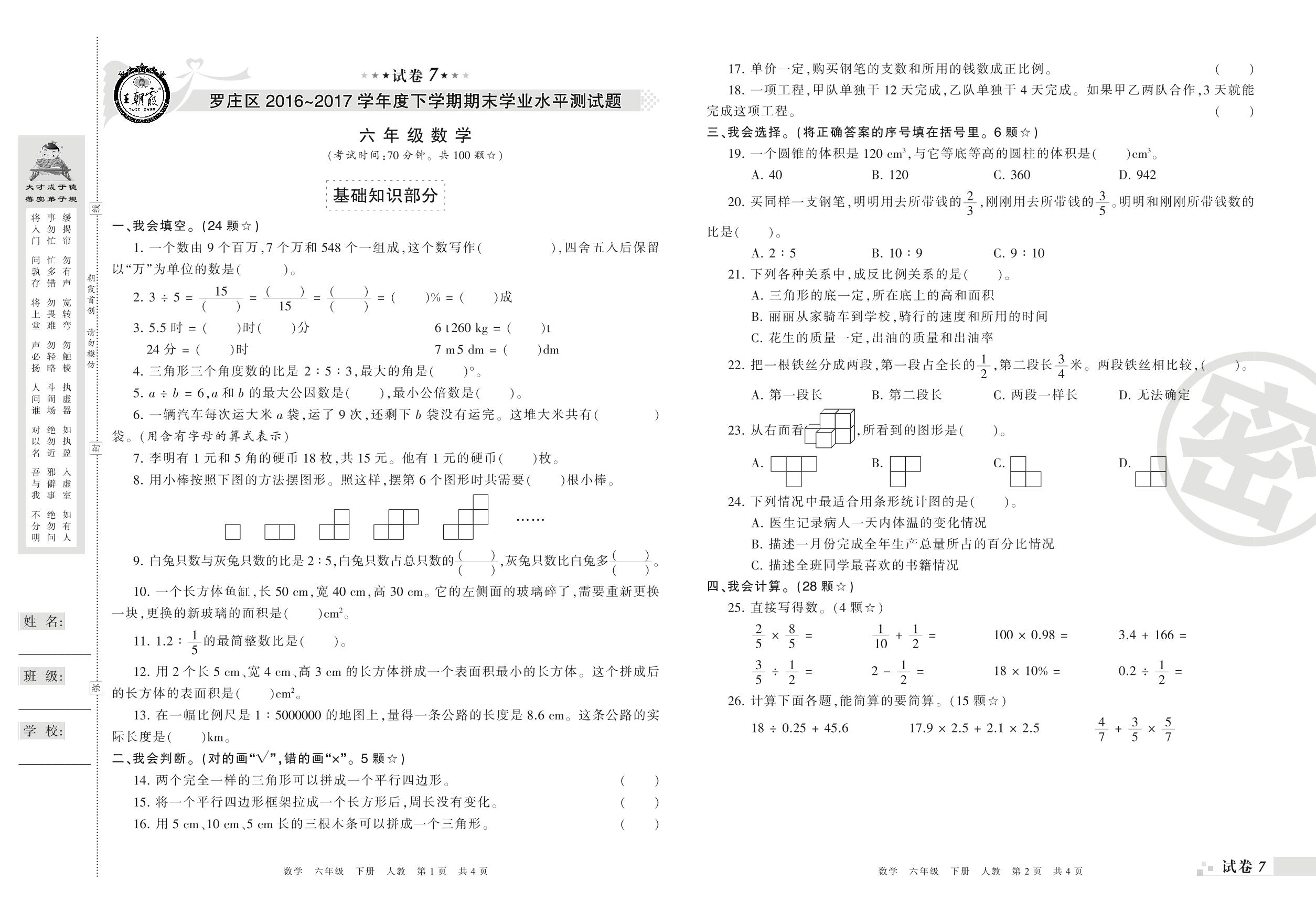 2016-2017学年第二学期临沂市罗庄区六年级数学试卷(人教版)【7】