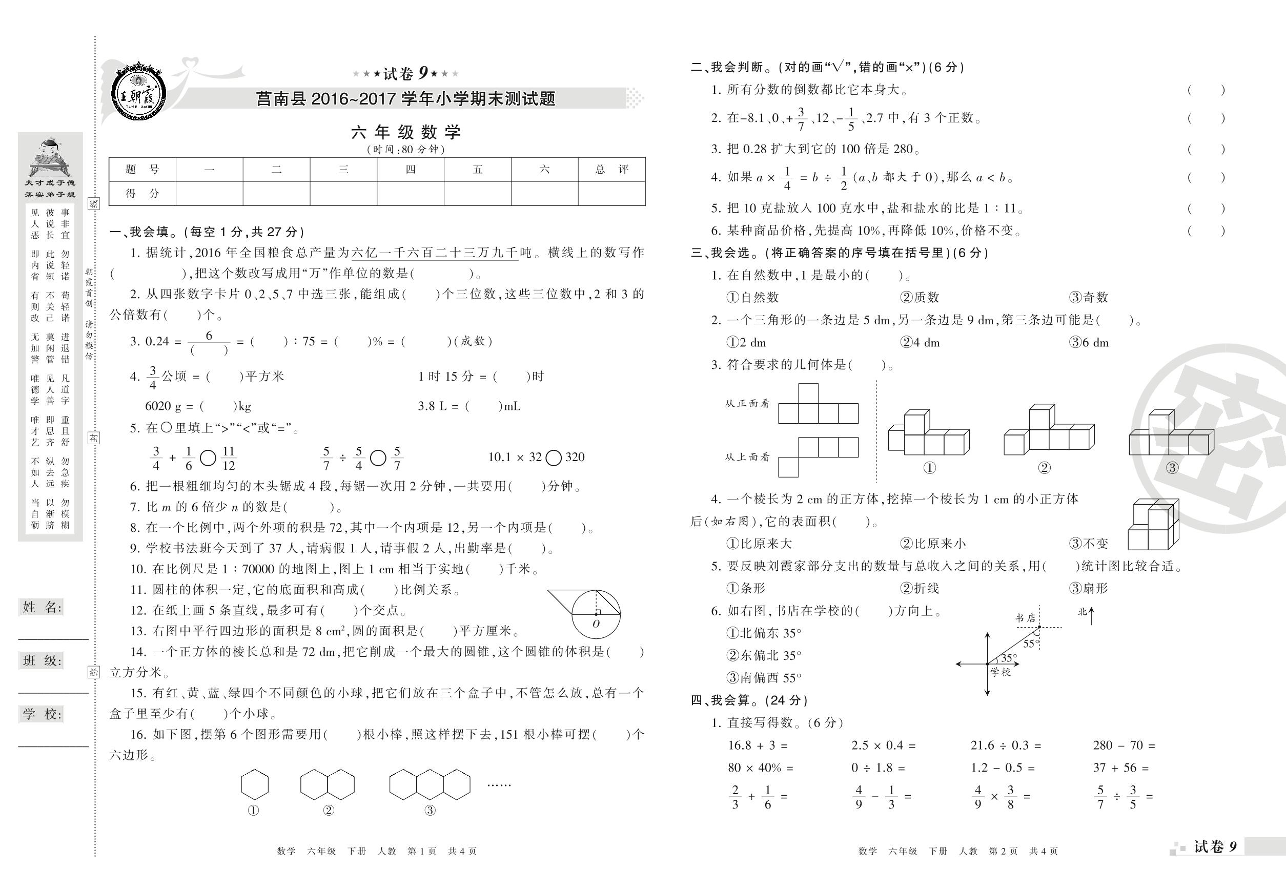 2016-2017学年第二学期临沂市莒南县六年级数学试卷(人教版)【9】