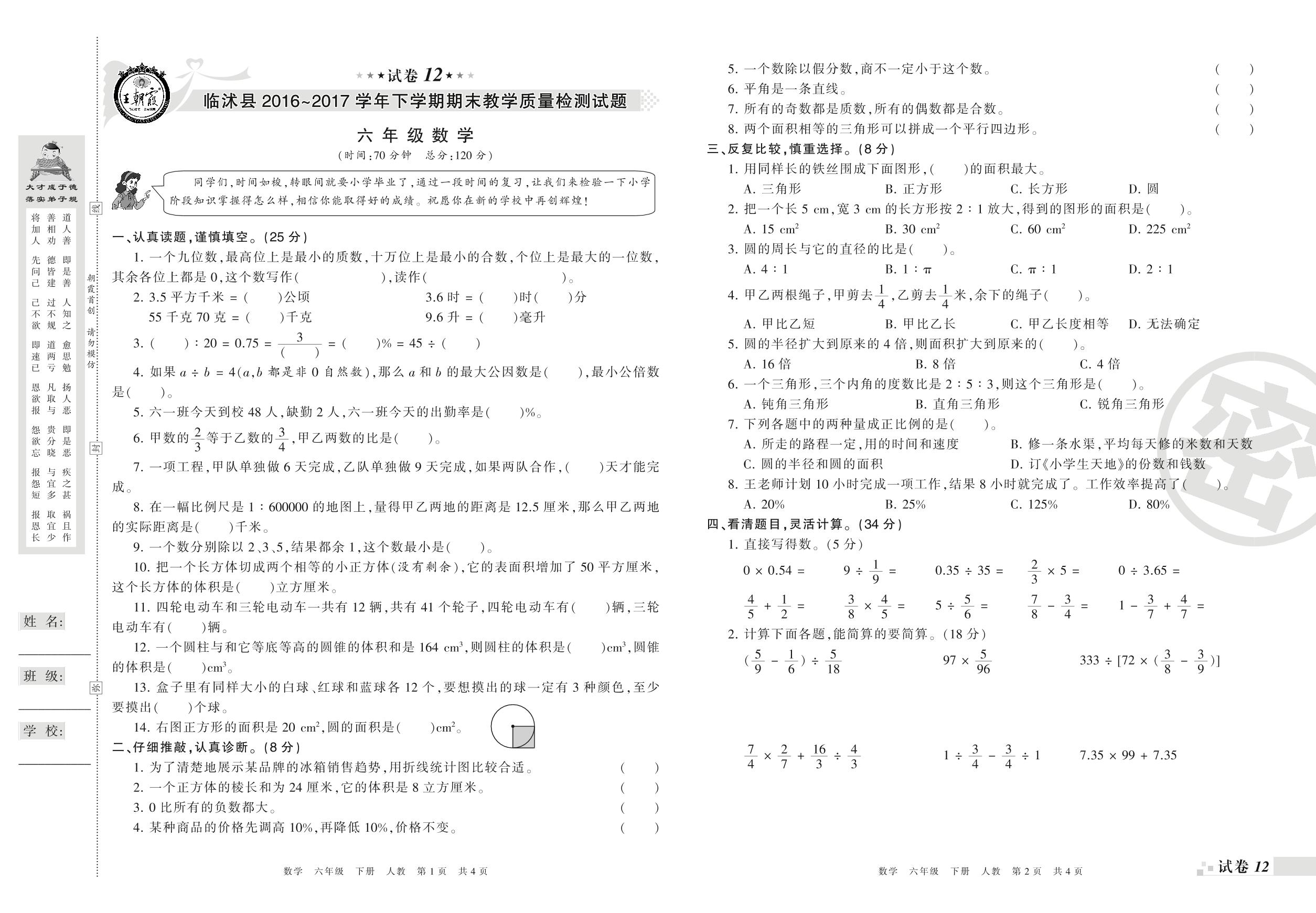 2016-2017学年第二学期临沂市临沭县六年级数学试卷(人教版)【12】