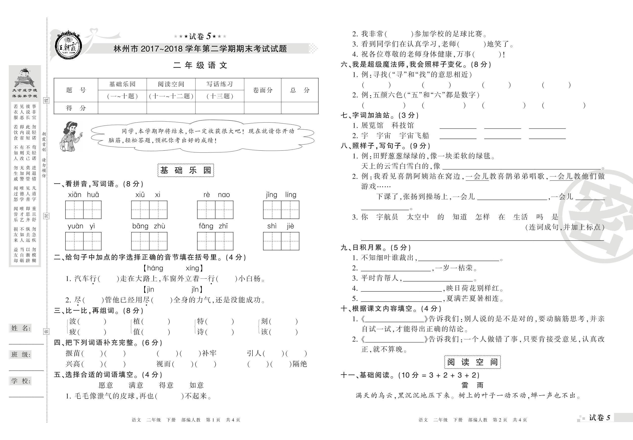 2017-2018学年第二学期林州市二年级语文试卷(人教版)【5】