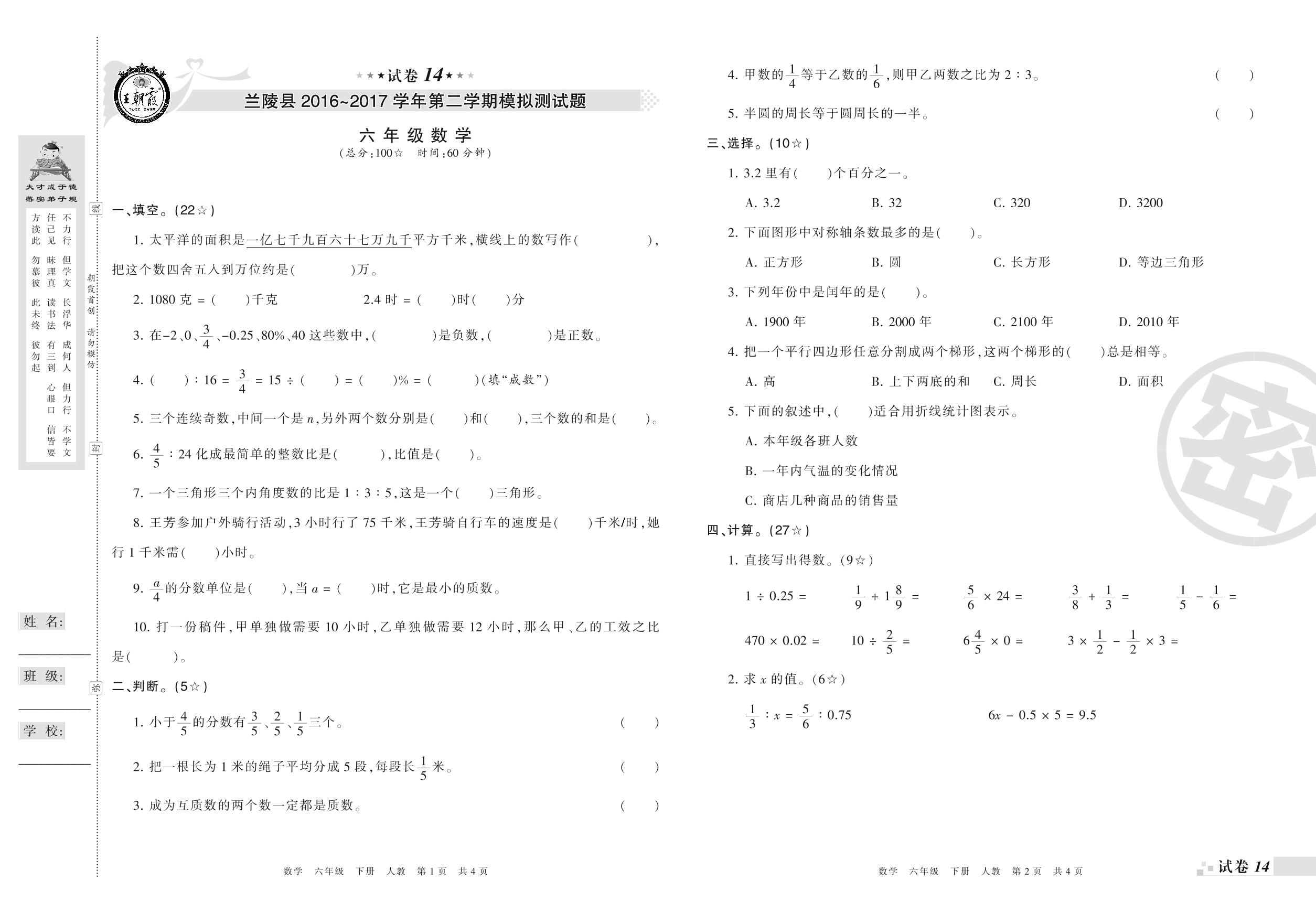 2016-2017学年第二学期临沂市兰陵县六年级数学试卷(人教版)【14】