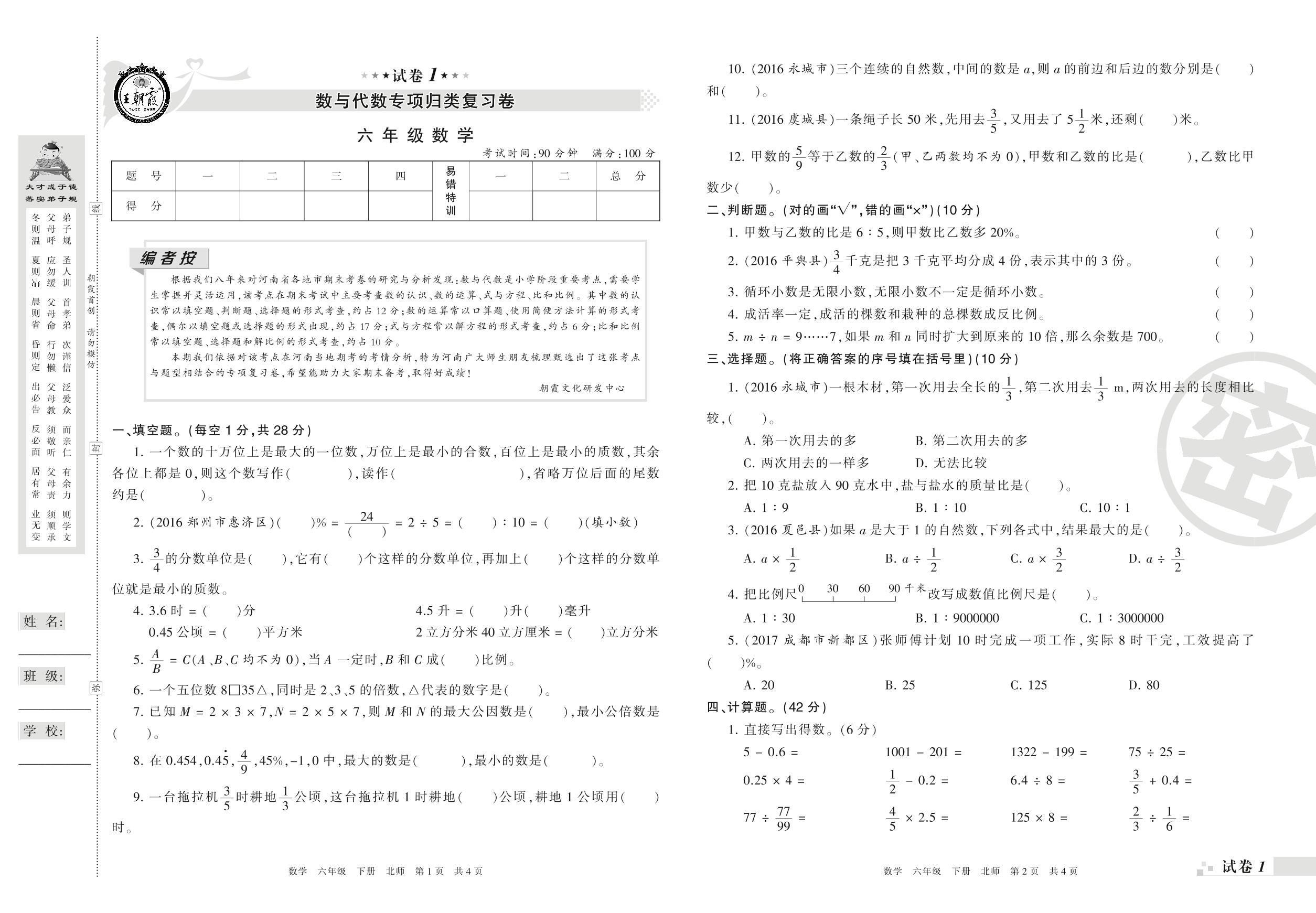 王朝霞期末专项卷——数与代数专项归类复习卷六年级下册数学(北师版)_R210805115210【1】